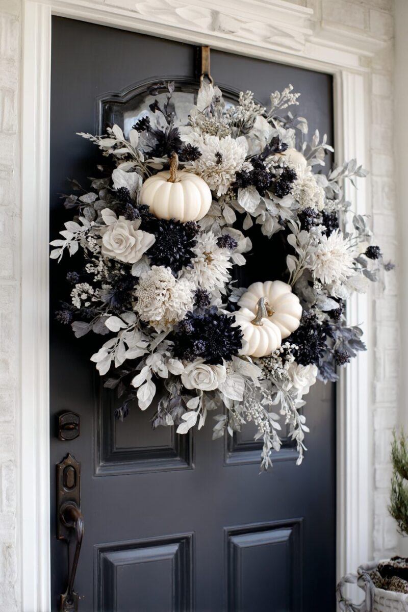 If you’re into minimalism, a simple wreath made with white pumpkins and black eucalyptus makes a huge impact.
