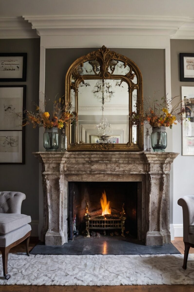 An antique mirror positioned above your farmhouse fireplace does double duty—reflecting light from both windows and the fire itself to create a brighter, more expansive-feeling space.