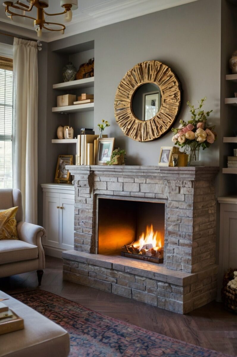 Introducing reclaimed wood elements around your fireplace instantly adds farmhouse character that new materials simply can’t replicate.
