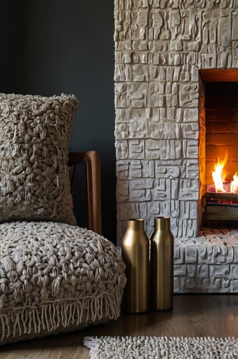 Consider incorporating a small vintage quilt folded on a nearby stool or draped over a drying rack positioned strategically by the hearth.