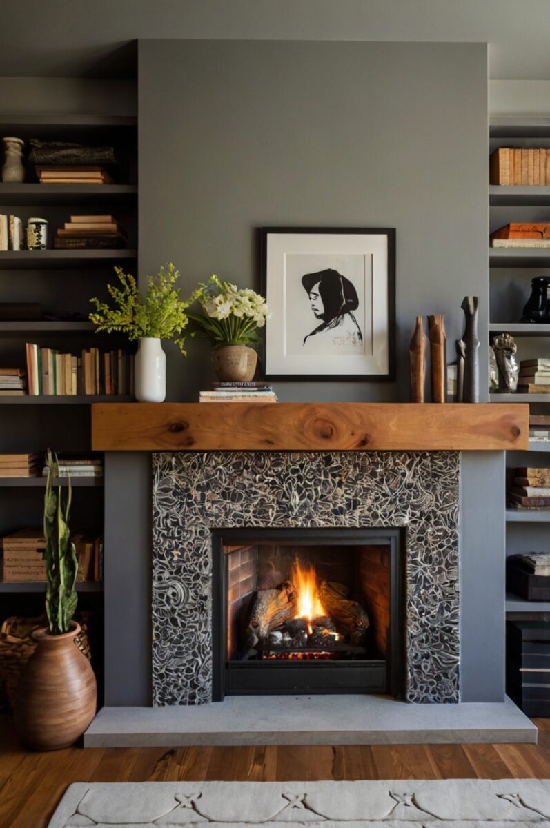 Small wooden accents like hand-carved bowls, antique wooden tools, or picture frames made from reclaimed wood can populate your mantel for a cohesive theme.