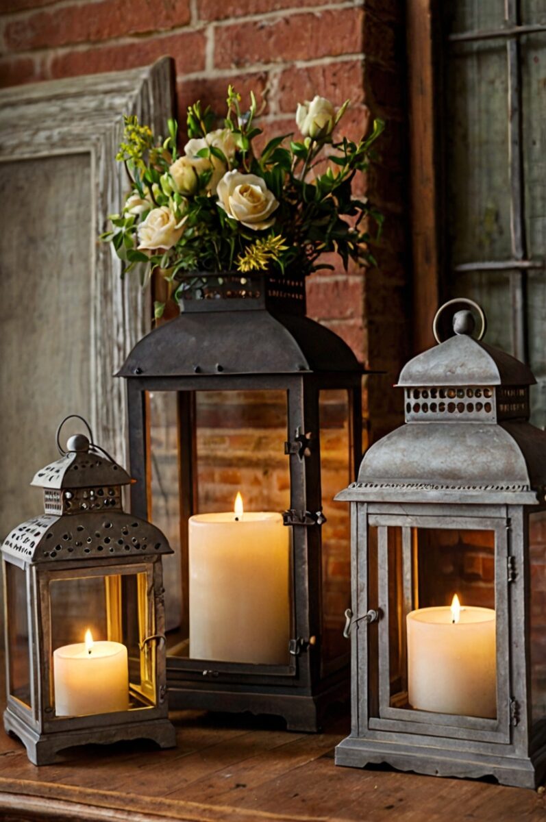 Grouping antique lanterns and candlesticks on and around your fireplace creates ambient lighting that harkens back to simpler times.