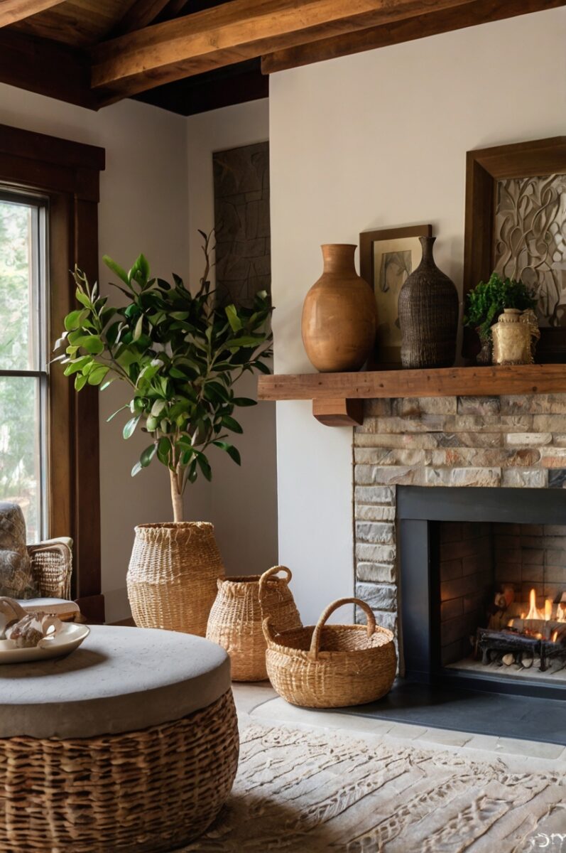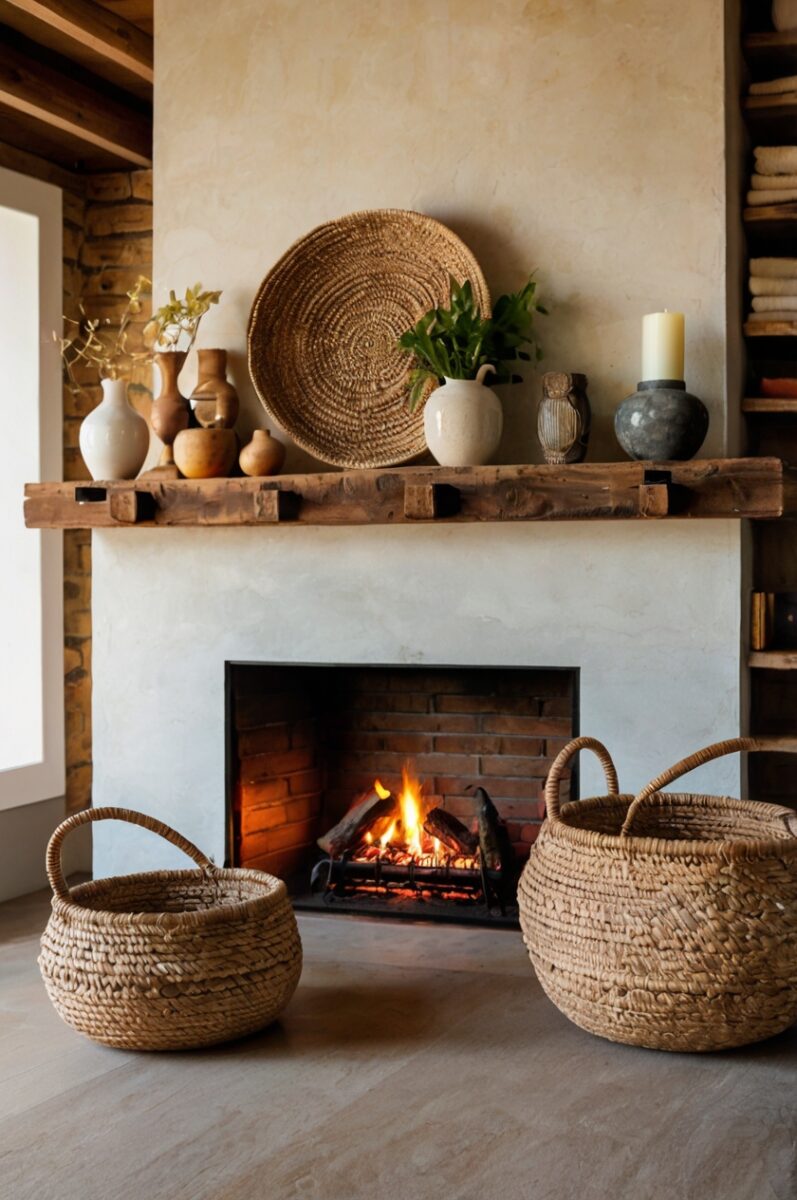 Incorporating natural fiber baskets around your fireplace serves the dual purpose of convenient firewood storage and adding organic texture to your space.