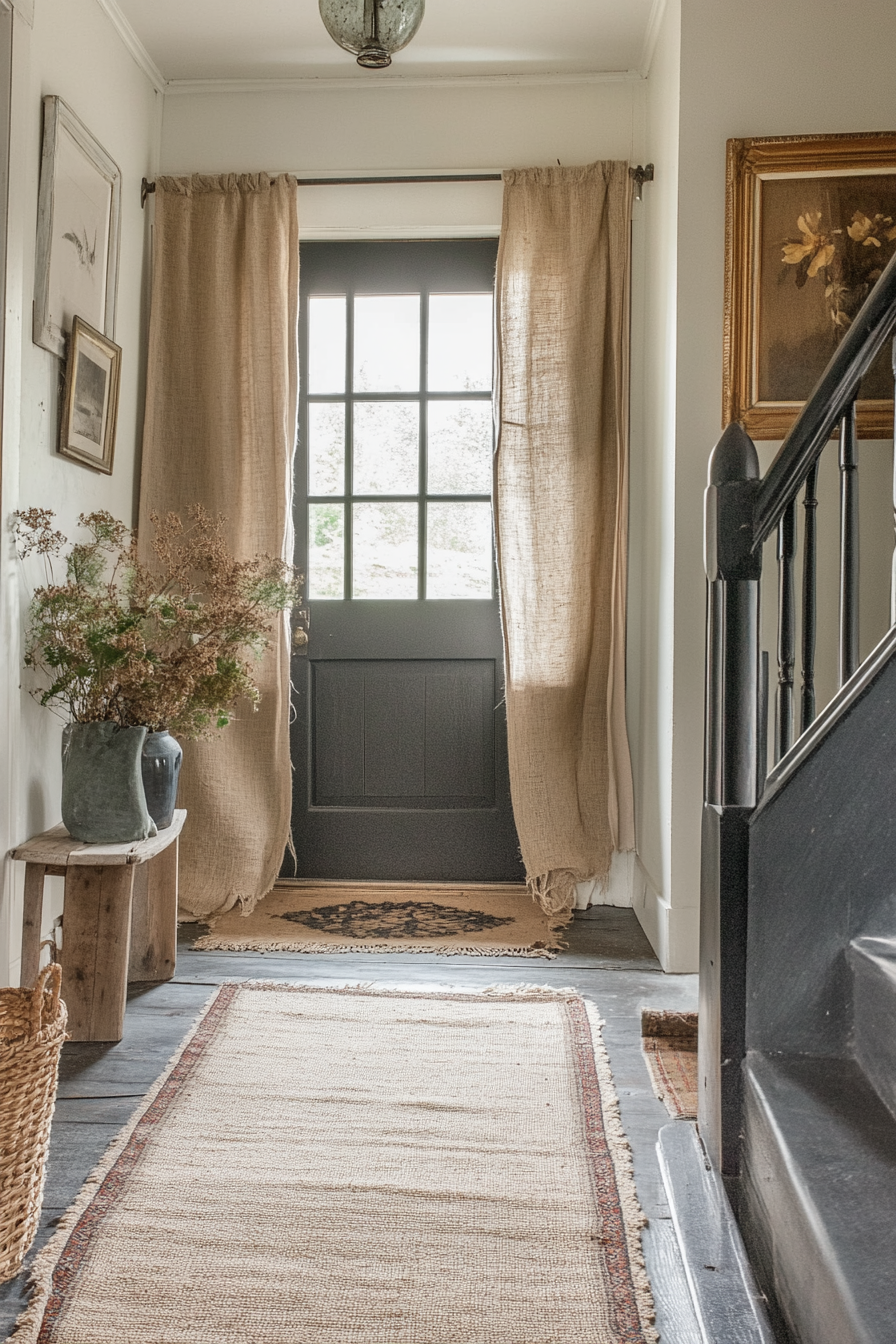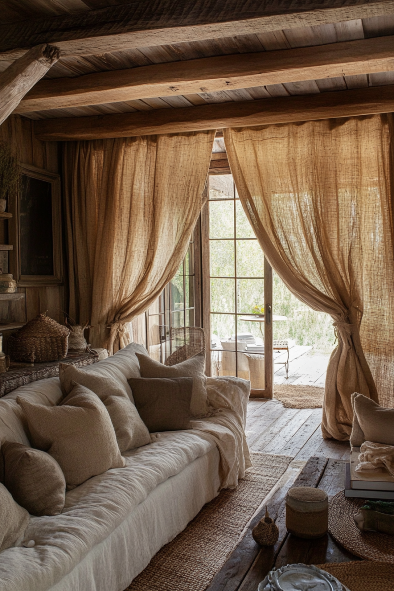 If you want to lean into the raw, organic feel of a farmhouse, burlap curtains are a perfect choice.