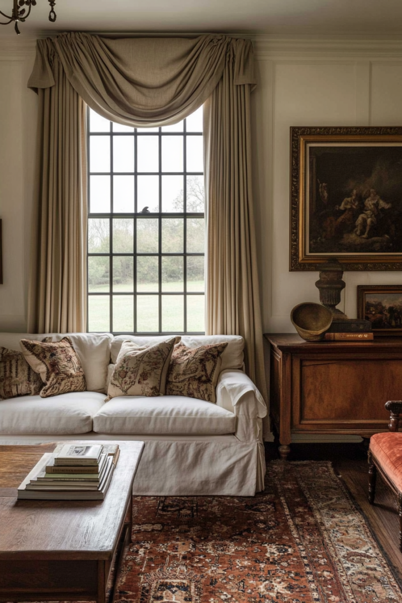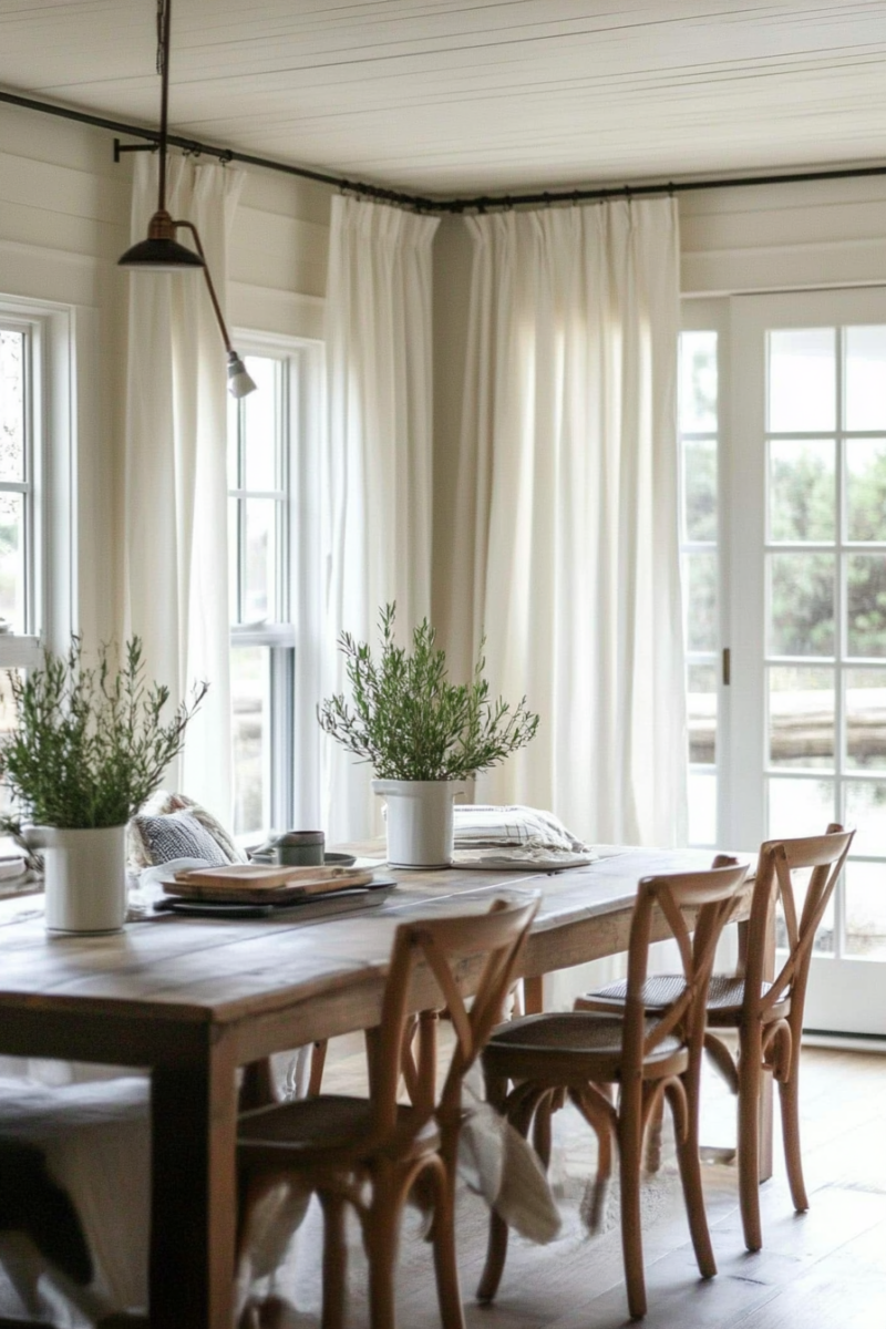 Drop cloth curtains are a budget-friendly and creative option for farmhouse window treatments.