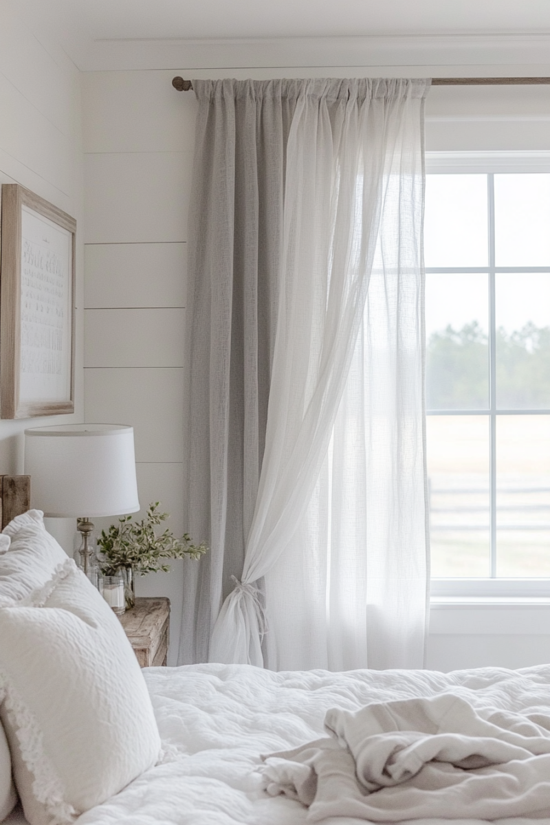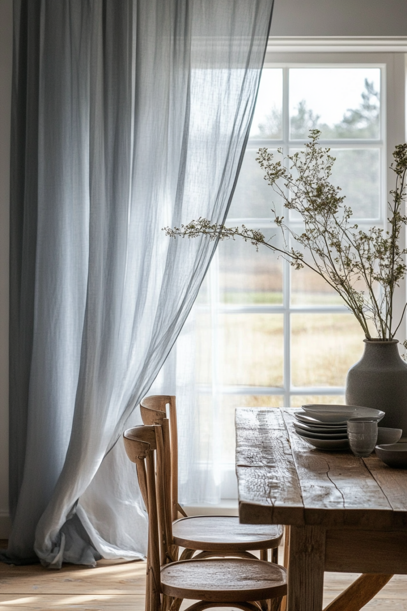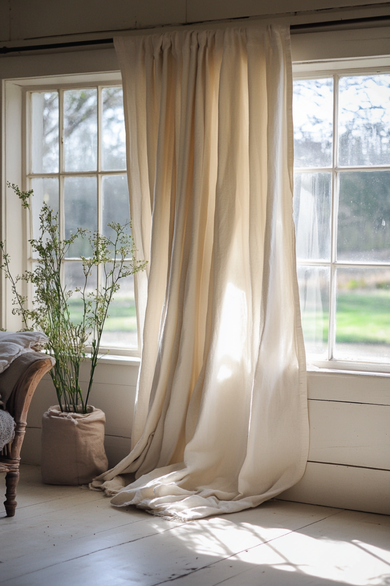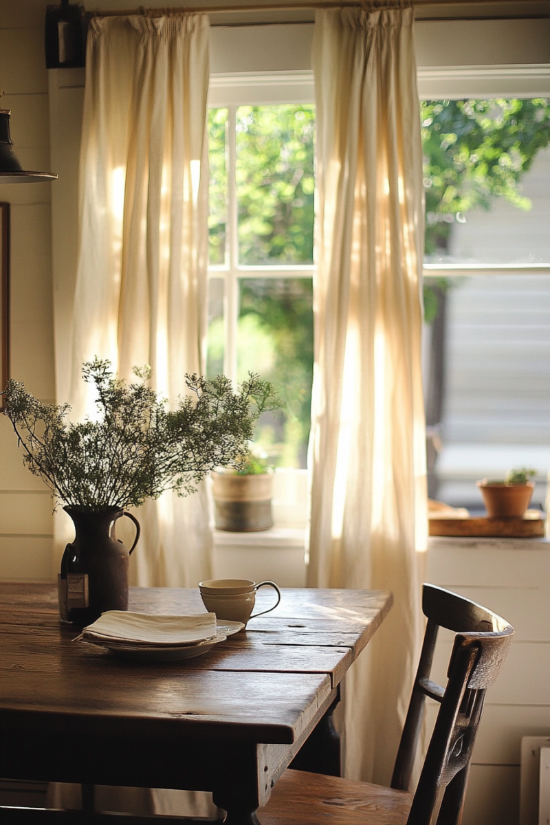 Sheer linen is an excellent choice because it has a slightly textured look that complements the rustic charm of a farmhouse.