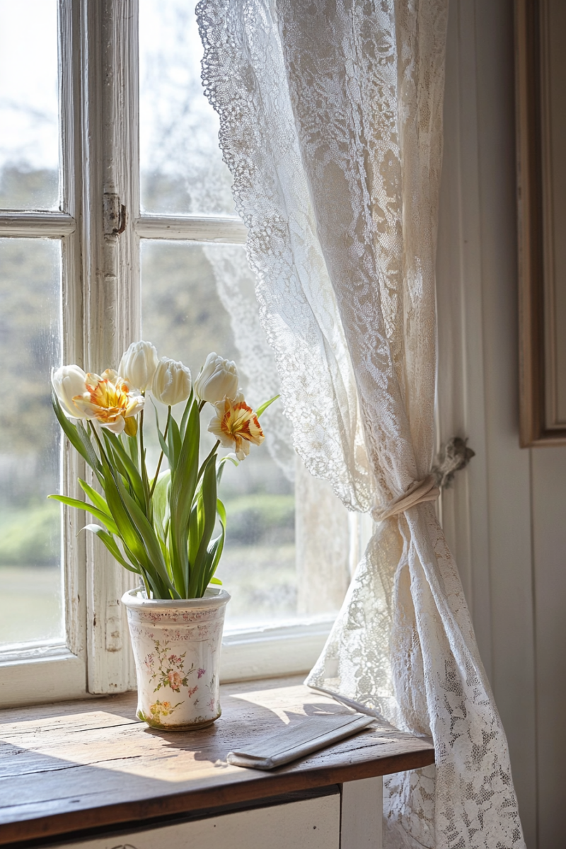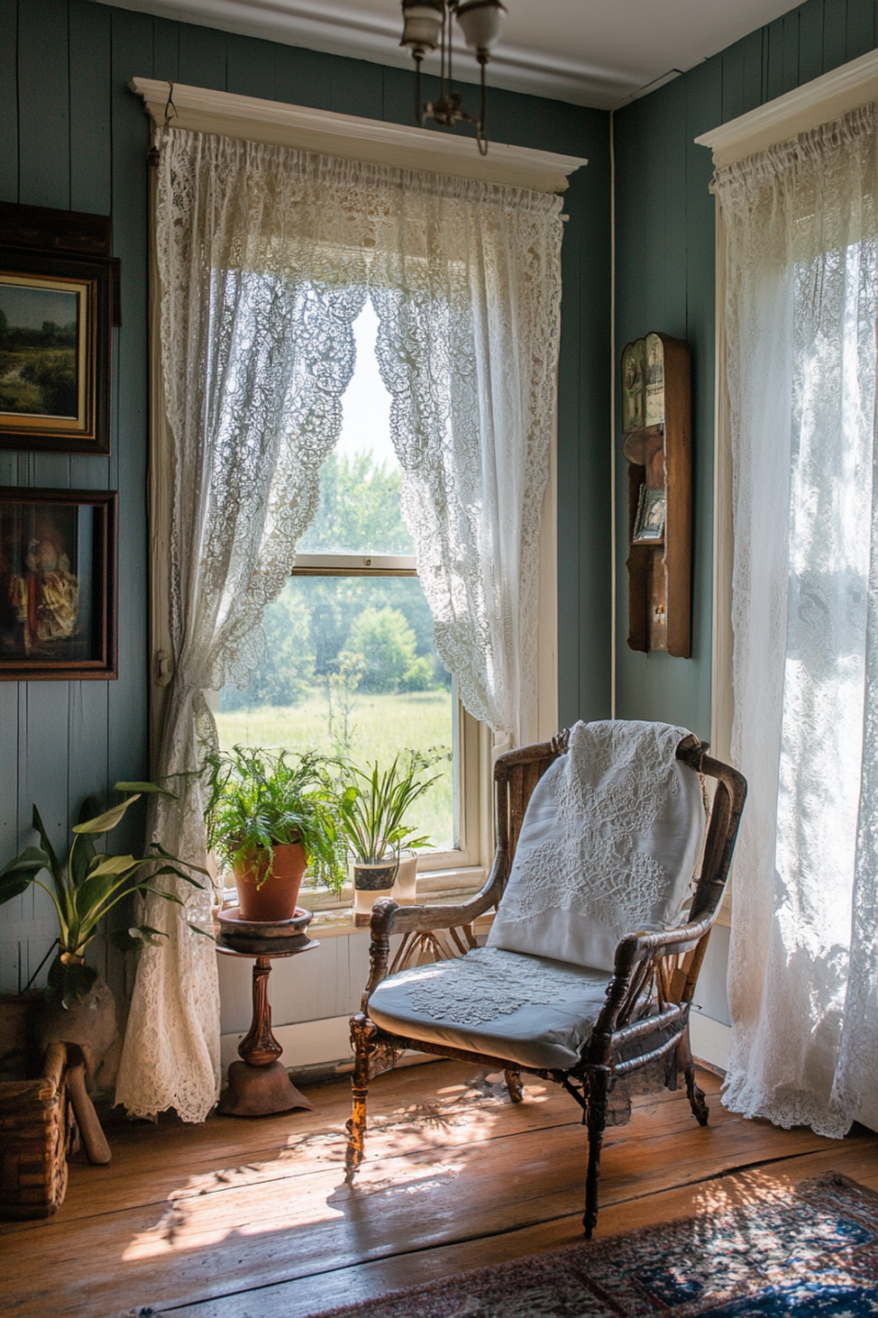 For a truly vintage feel, look for lace curtains with scalloped edges or floral patterns.