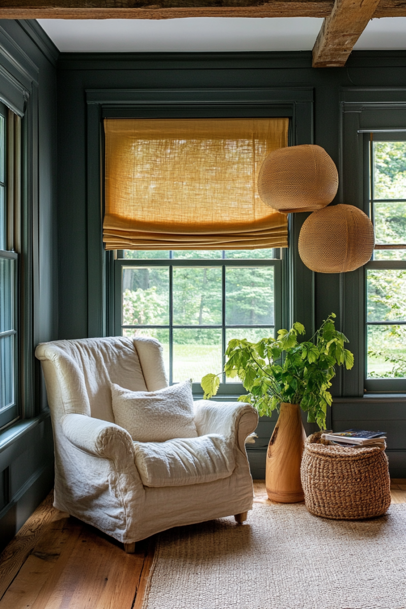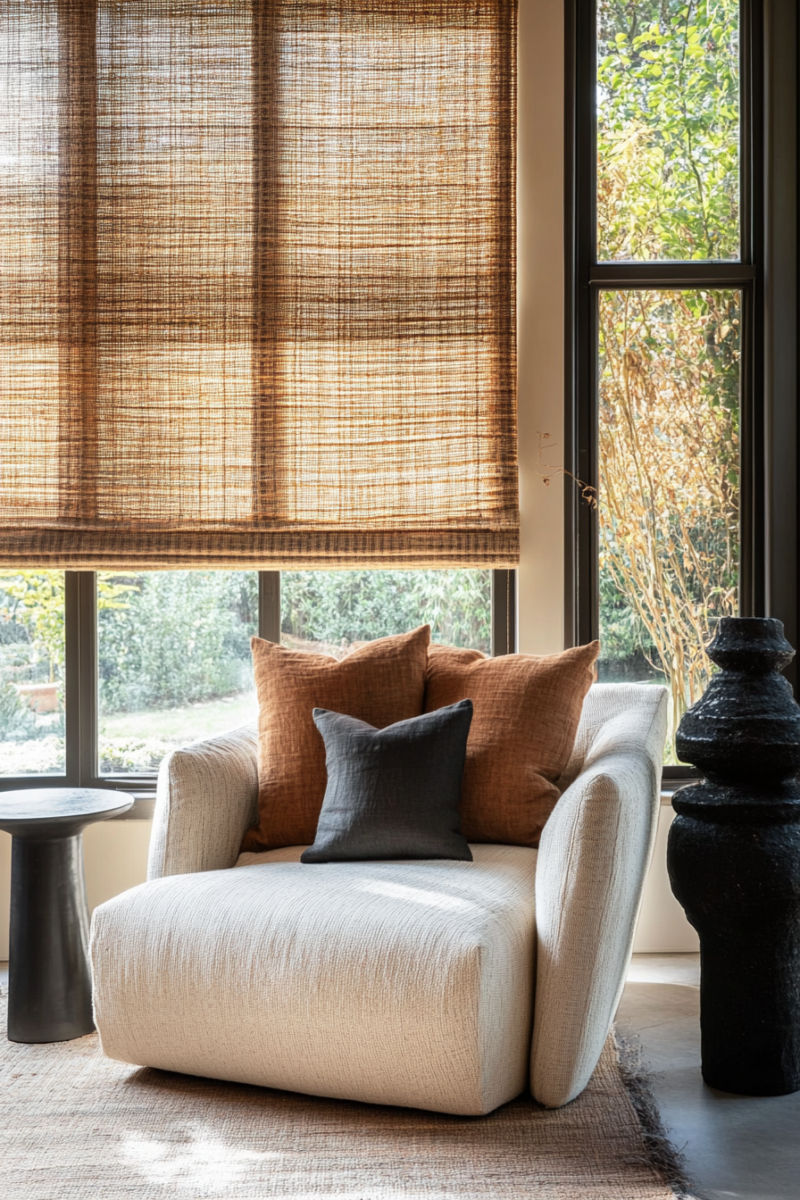 This combination balances the natural texture of the shades with the softness of fabric, creating a well-rounded look.