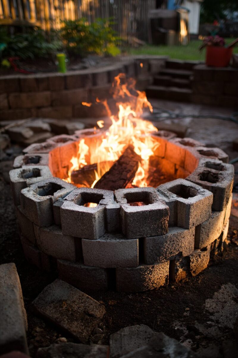 If using cinder blocks, position them with hollow cores horizontally rather than vertically, creating interesting light patterns when illuminated by flames while improving the structure’s heat resistance.