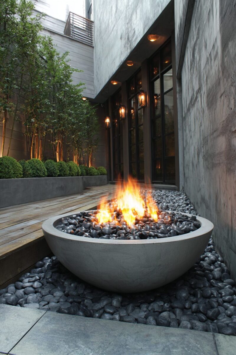 For smaller spaces, tabletop concrete fire bowls provide the same design aesthetic at a scale appropriate for intimate patios or balcony settings.