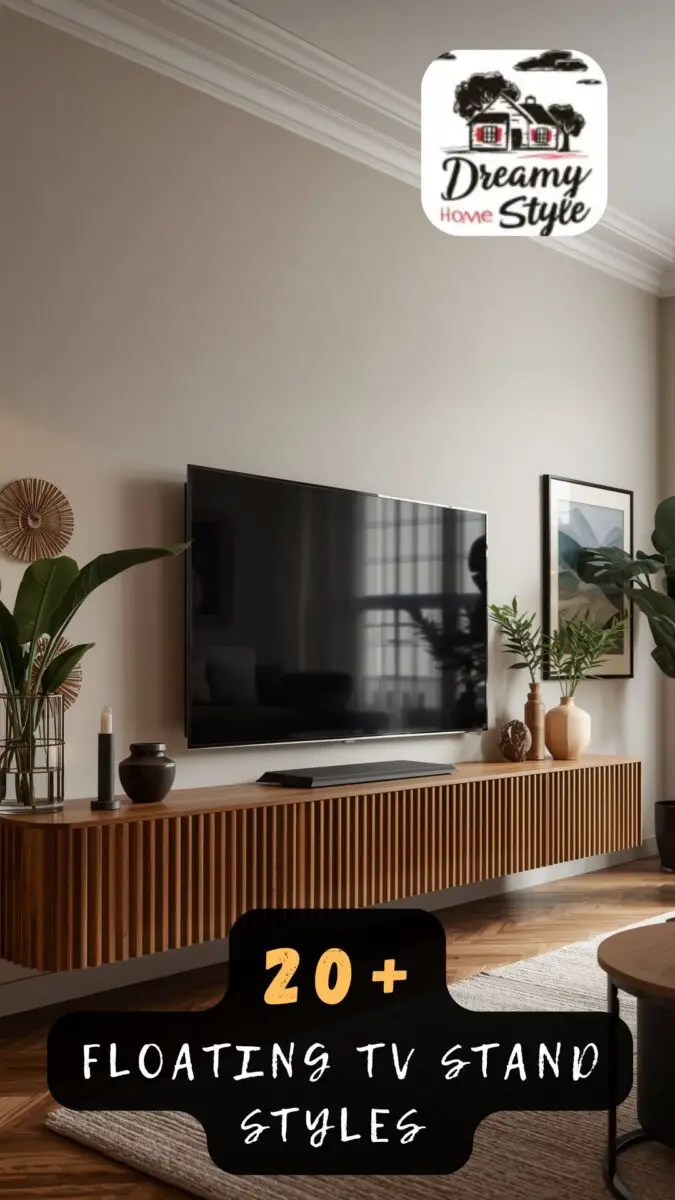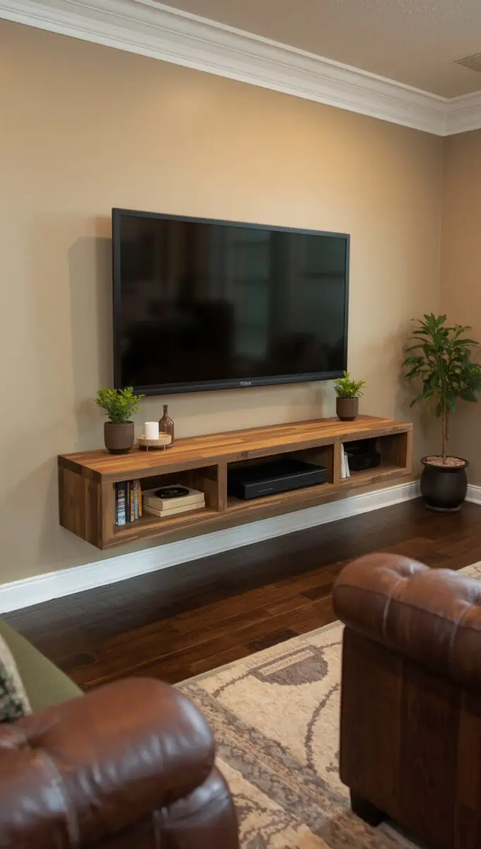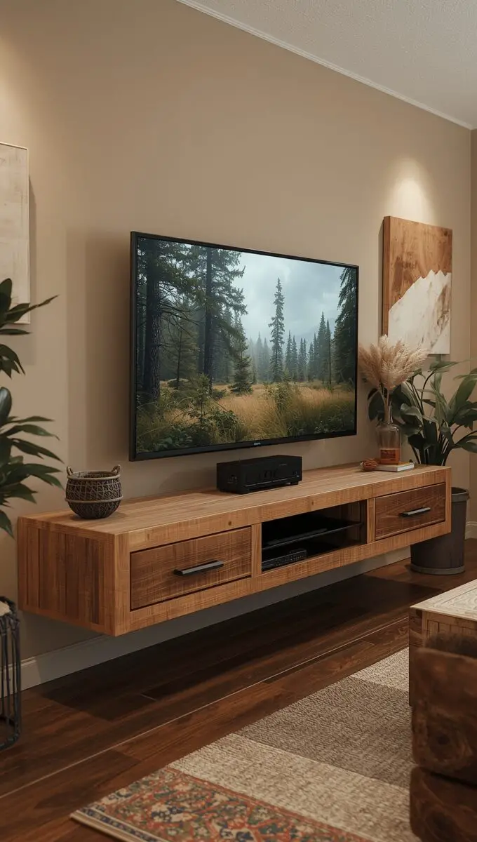 For those who love the charm of natural wood, a rustic wood floating TV stand brings warmth and texture to your living room — this piece is perfect if you’re aiming for a cozy, farmhouse TV stand decoration.