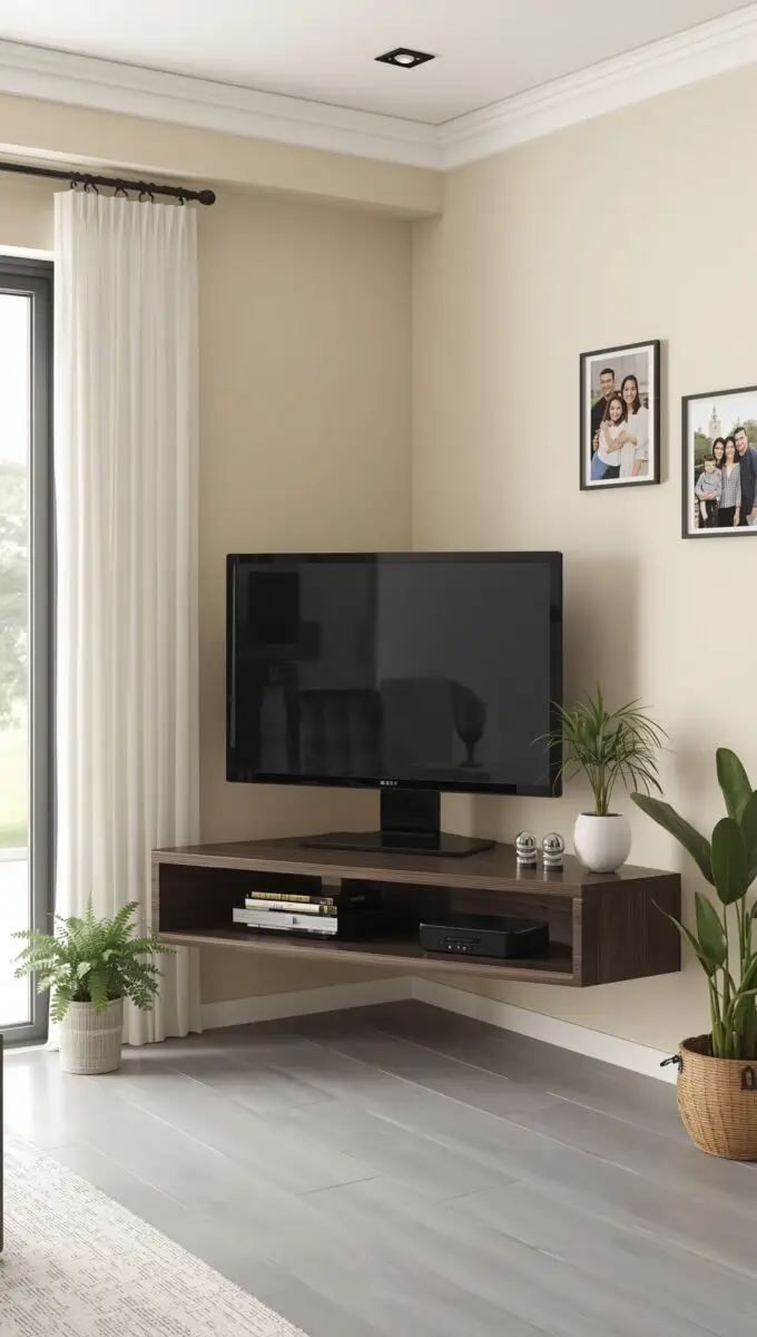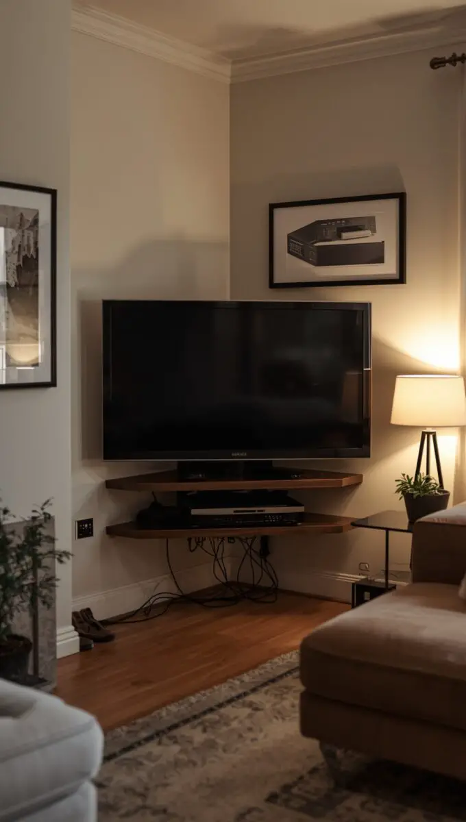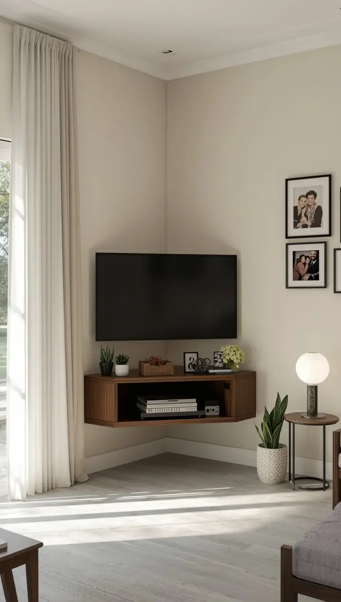Maximize your space with a floating corner TV stand — this clever design lets you tuck your TV neatly into a corner while maintaining a clean, open floor plan, a fantastic option for smaller rooms that need to make every inch count without sacrificing style.