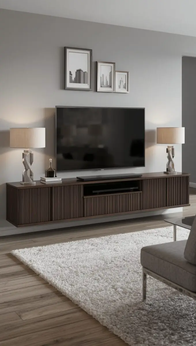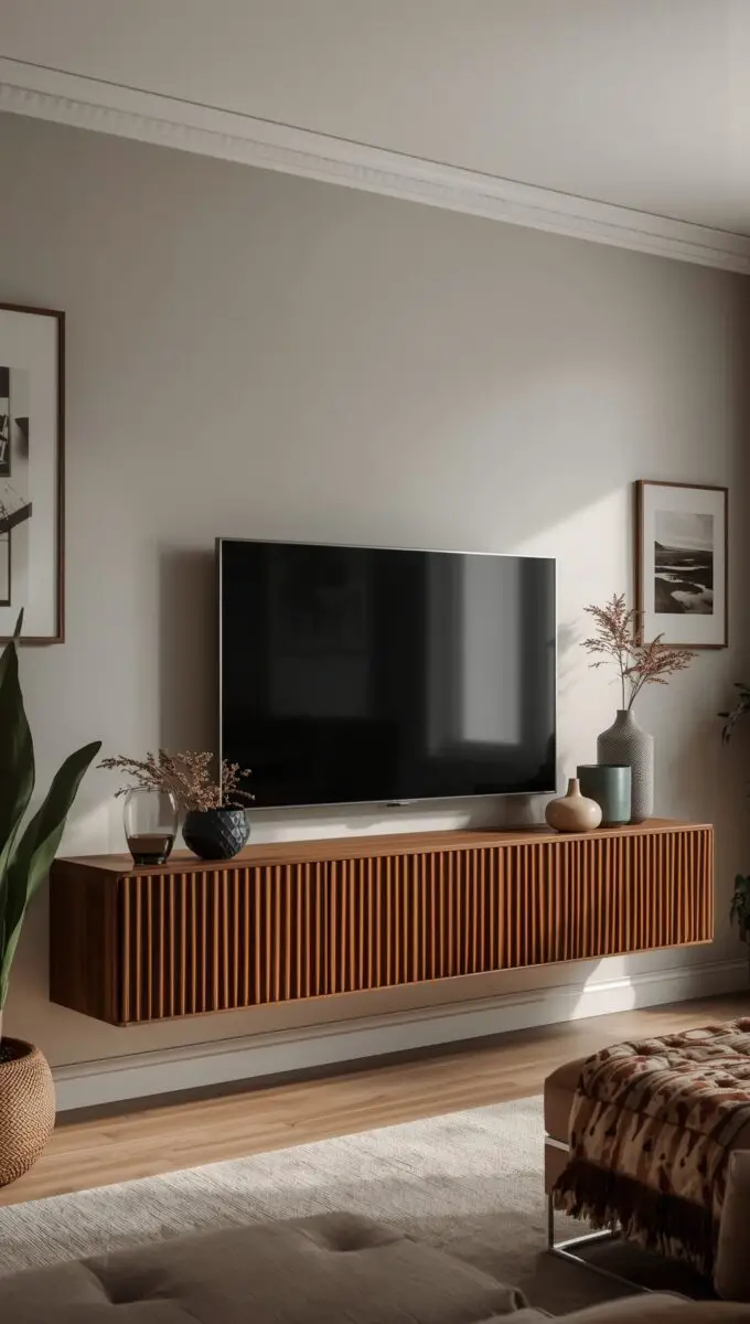 If you’re looking for a floating TV stand idea that adds both texture and elegance, consider one with a fluted panel design — these ribbed finishes create a subtle play of light and shadow, making your wall look more dynamic without adding clutter.
