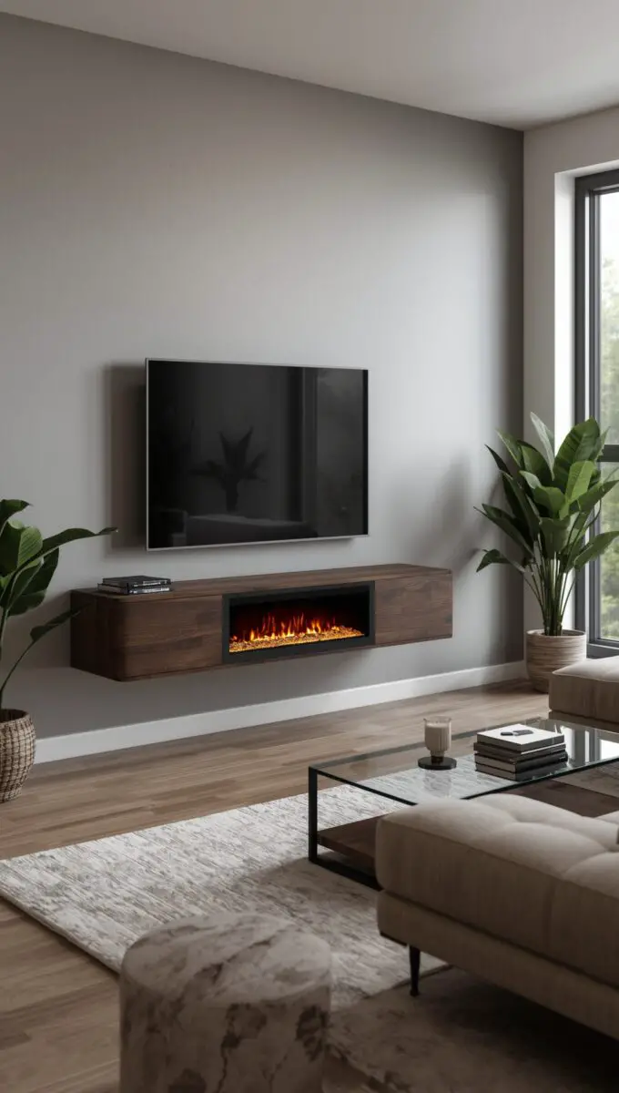 For a cozy, winter-night vibe all year round, a floating fireplace TV stand is a must-have — this design marries modern tech with classic charm, offering both a place for your TV and a soothing electric fireplace for ambiance — perfect for cold evenings and Netflix binges.