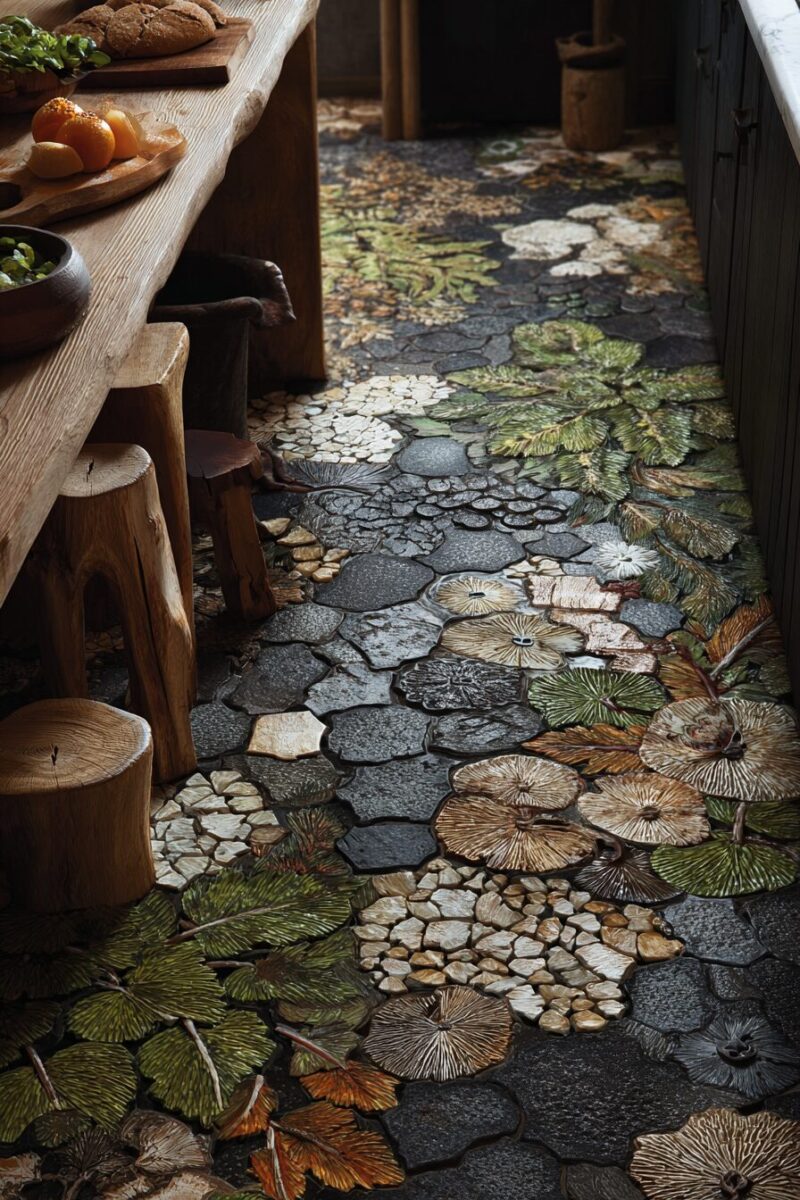 Transform your kitchen floor into a stunning replica of the forest floor using innovative tile designs that capture the organic beauty of fallen leaves, moss, and woodland textures.