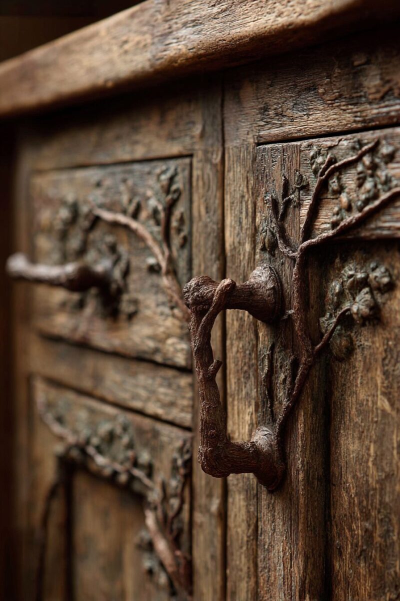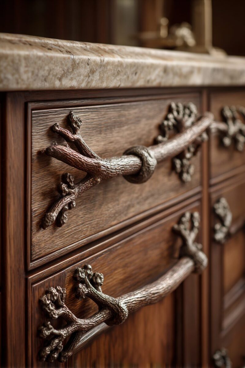 Ditch those boring metal handles and transform your cabinets with custom tree branch hardware that adds authentic woodland character to every door and drawer.