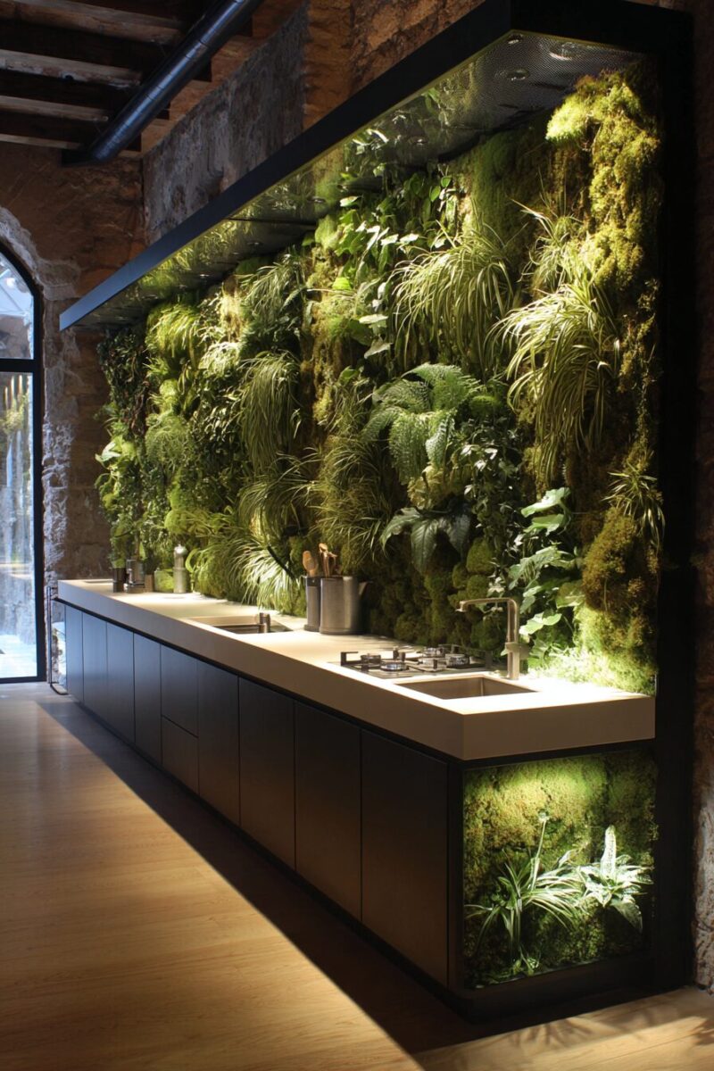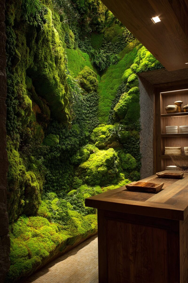 Nothing says “forest” quite like a living moss wall that transforms your kitchen backsplash into a breathing piece of woodland art.