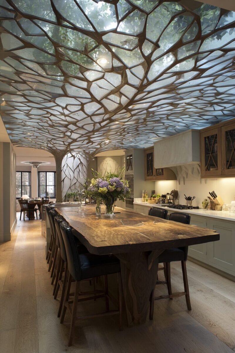 The psychological effect is profound – your ceiling treatment creates an open, airy feeling that makes the kitchen feel larger while maintaining the intimate, sheltered sensation of cooking in a forest clearing.