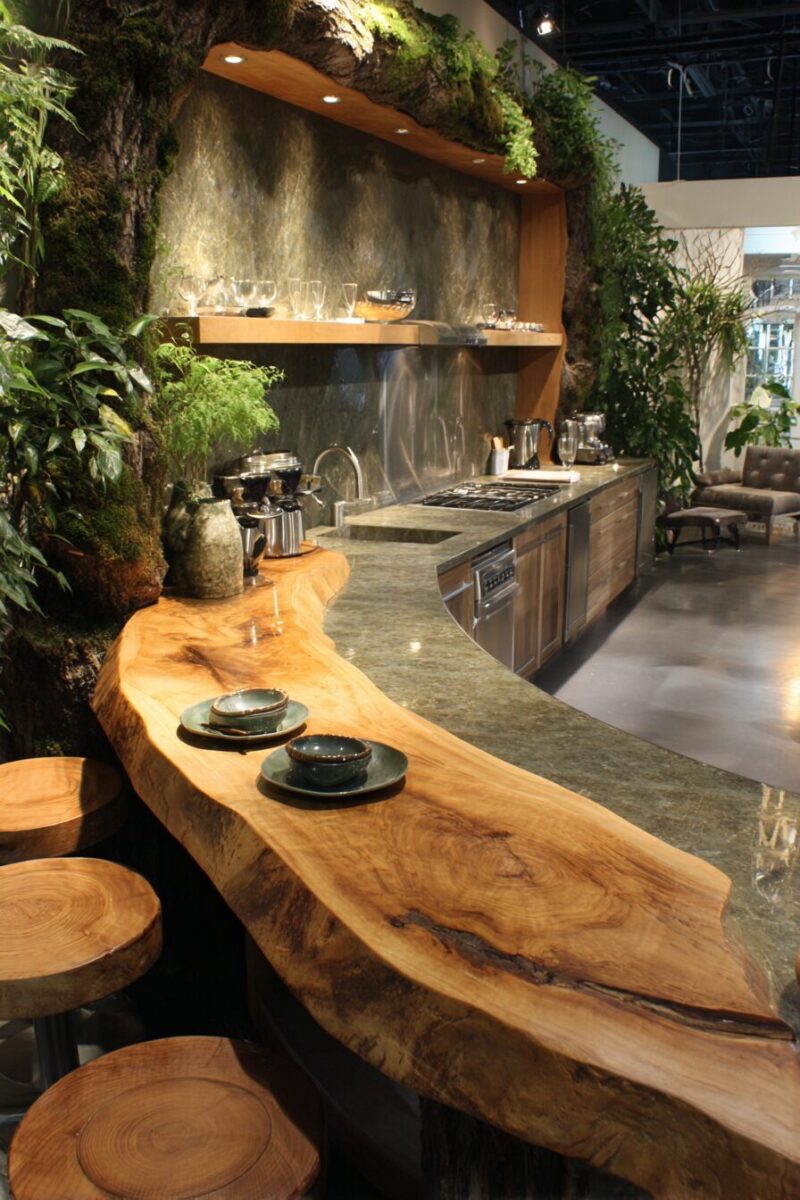 Push beyond traditional countertops with living wood installations that incorporate preserved tree sections, complete with bark and natural edges, creating organic work surfaces that feel like forest clearing picnic tables.