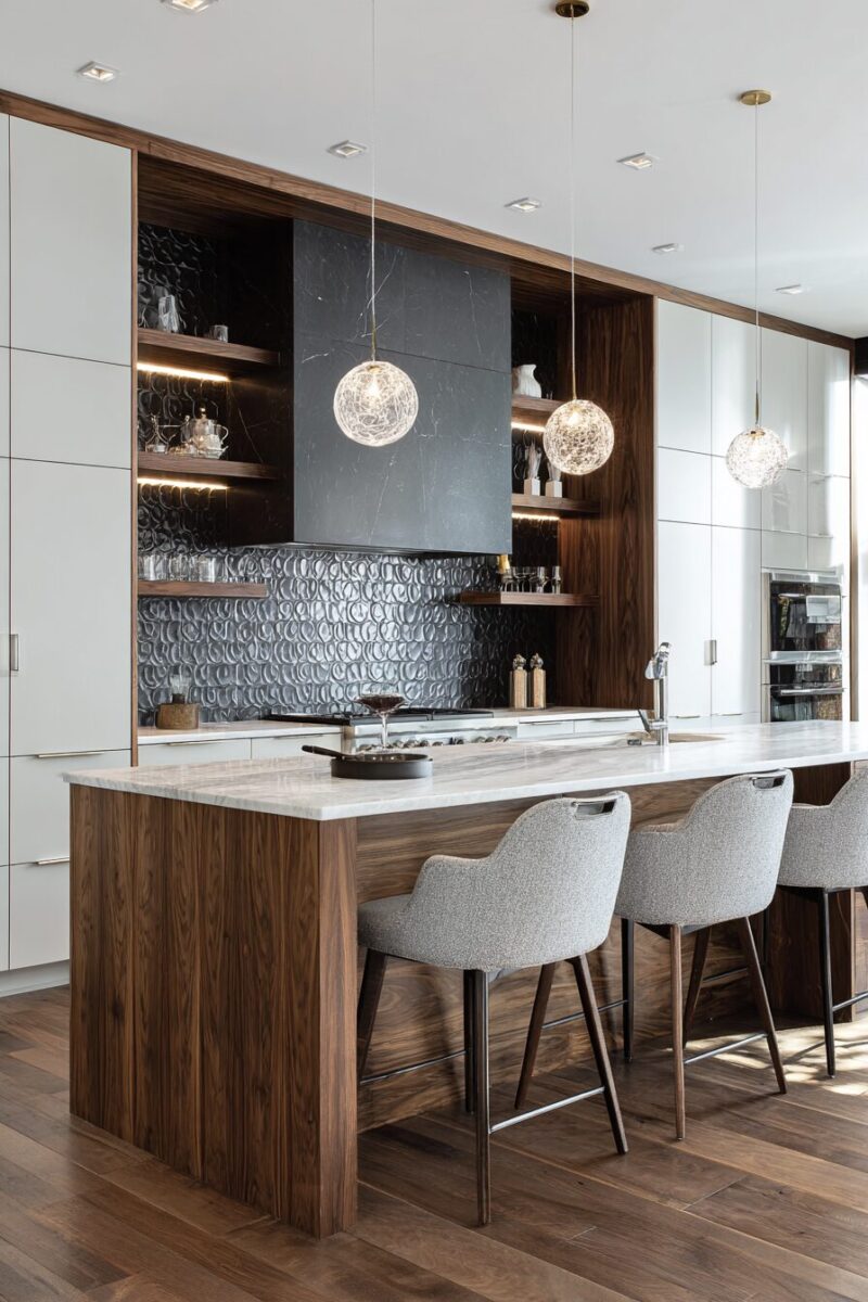 You can combine different wood species to create visual interest – perhaps a rich walnut island paired with lighter maple perimeter counters, or dramatic cherry wood accents against neutral quartz backgrounds.