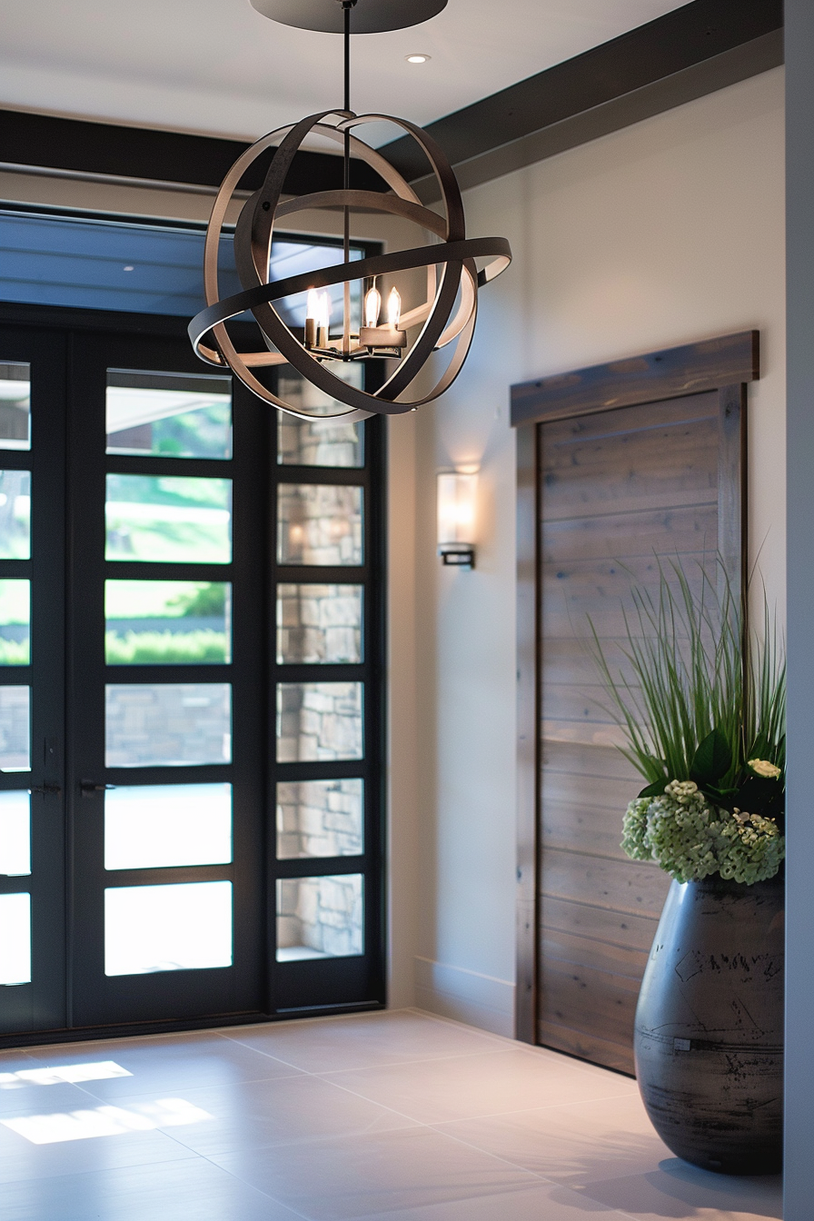 For traditional home decor, a crystal chandelier with curved arms and dangling prisms will accent your entry beautifully.