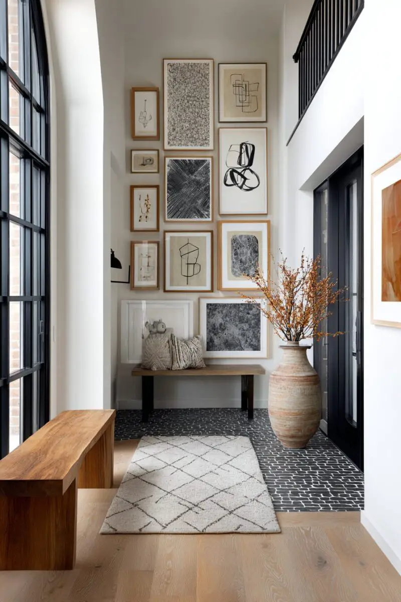 The height of your gallery wall should allow comfortable viewing for people of different heights while maintaining proper proportions within your entryway space.