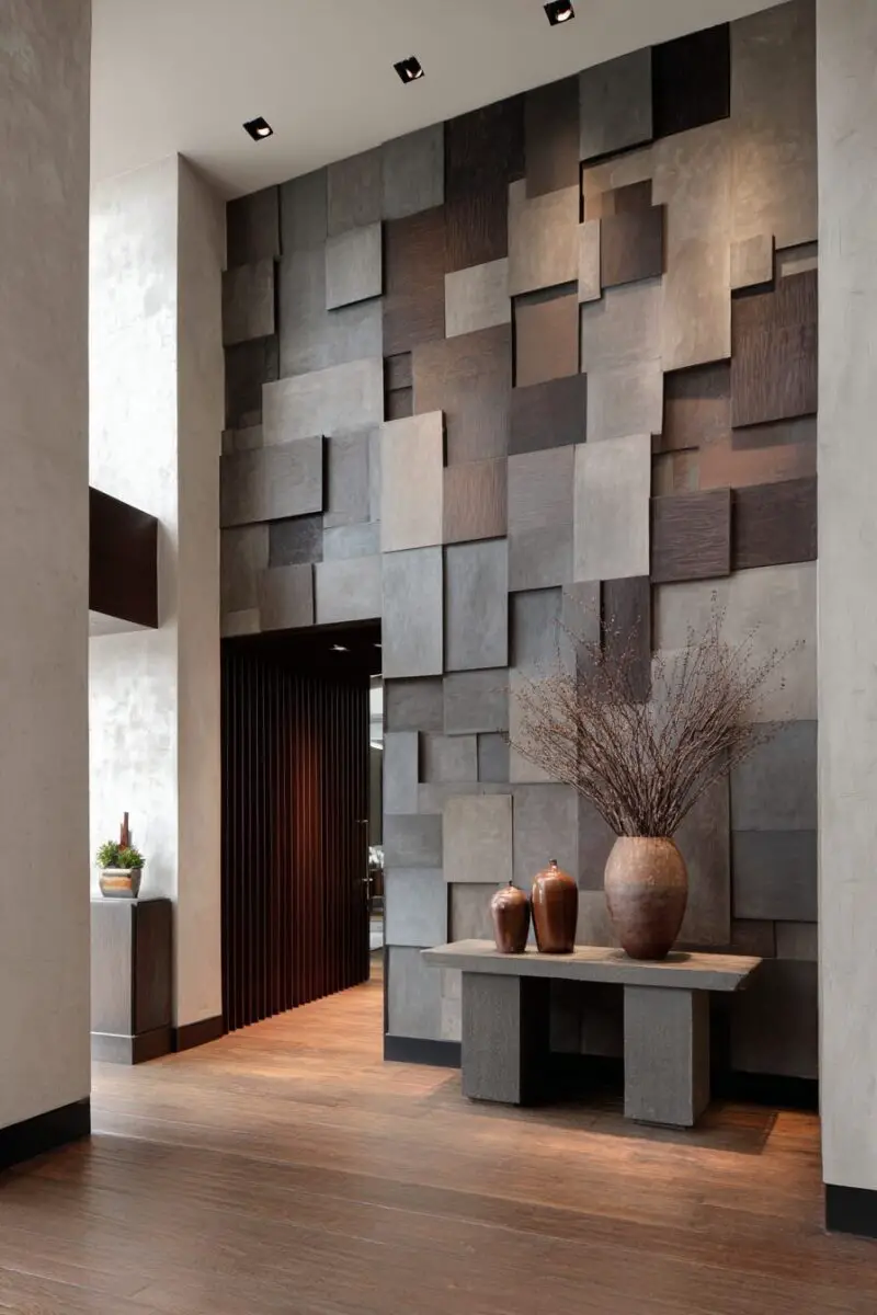 13 Rustic Entryways That Define First ImpressionsStatement Wall with Textured Materials