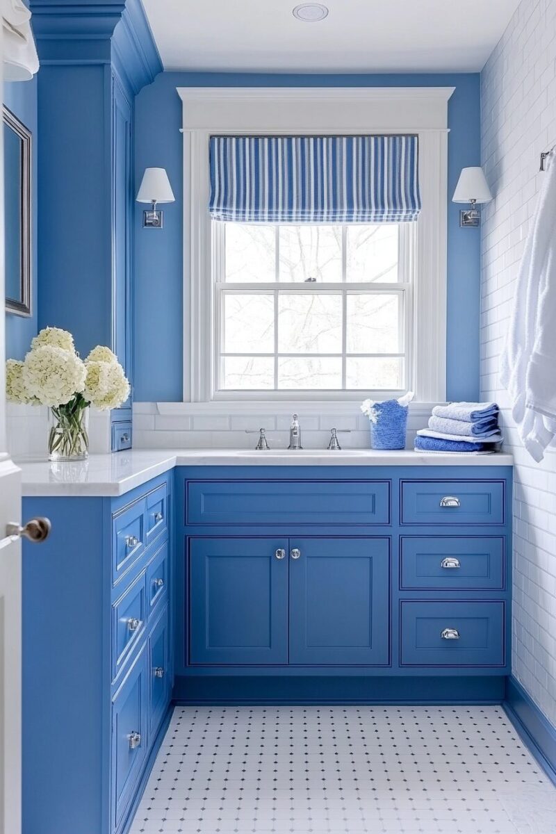 White fixtures stand out brilliantly against French blue backgrounds, mimicking the crisp contrast of a sailboat against deep ocean waters.