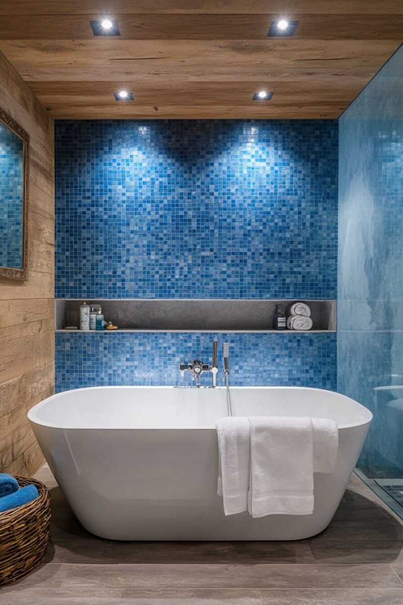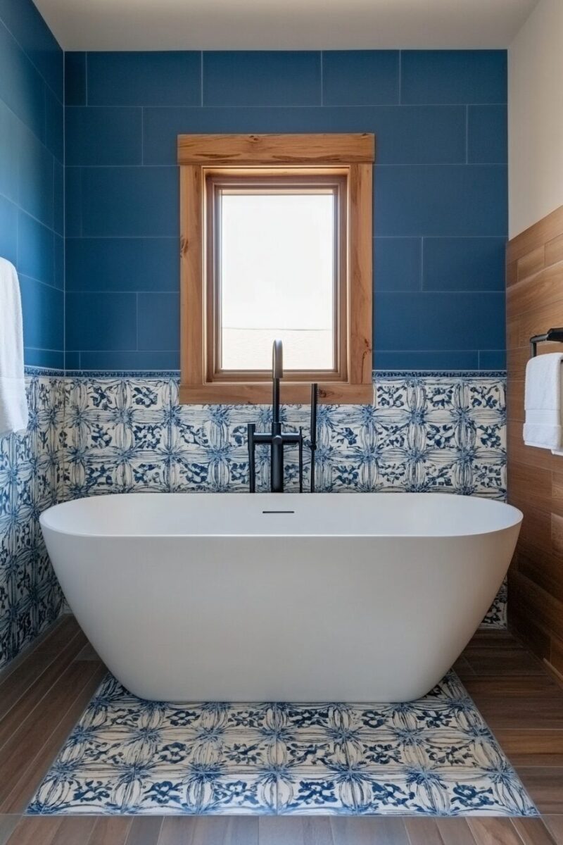 For a more subtle approach, consider using patterned French blue tiles only in a shower niche or as a thin border, allowing them to serve as an elegant accent rather than the main event.