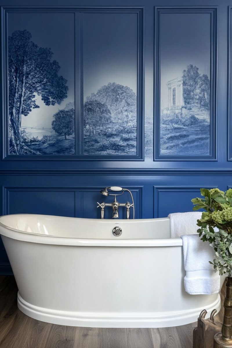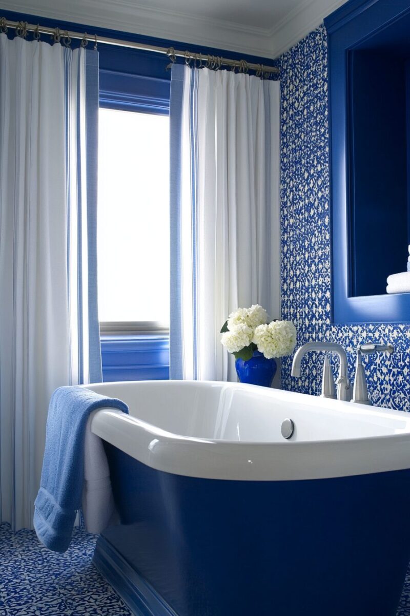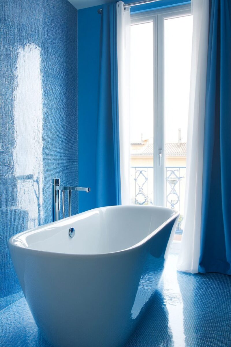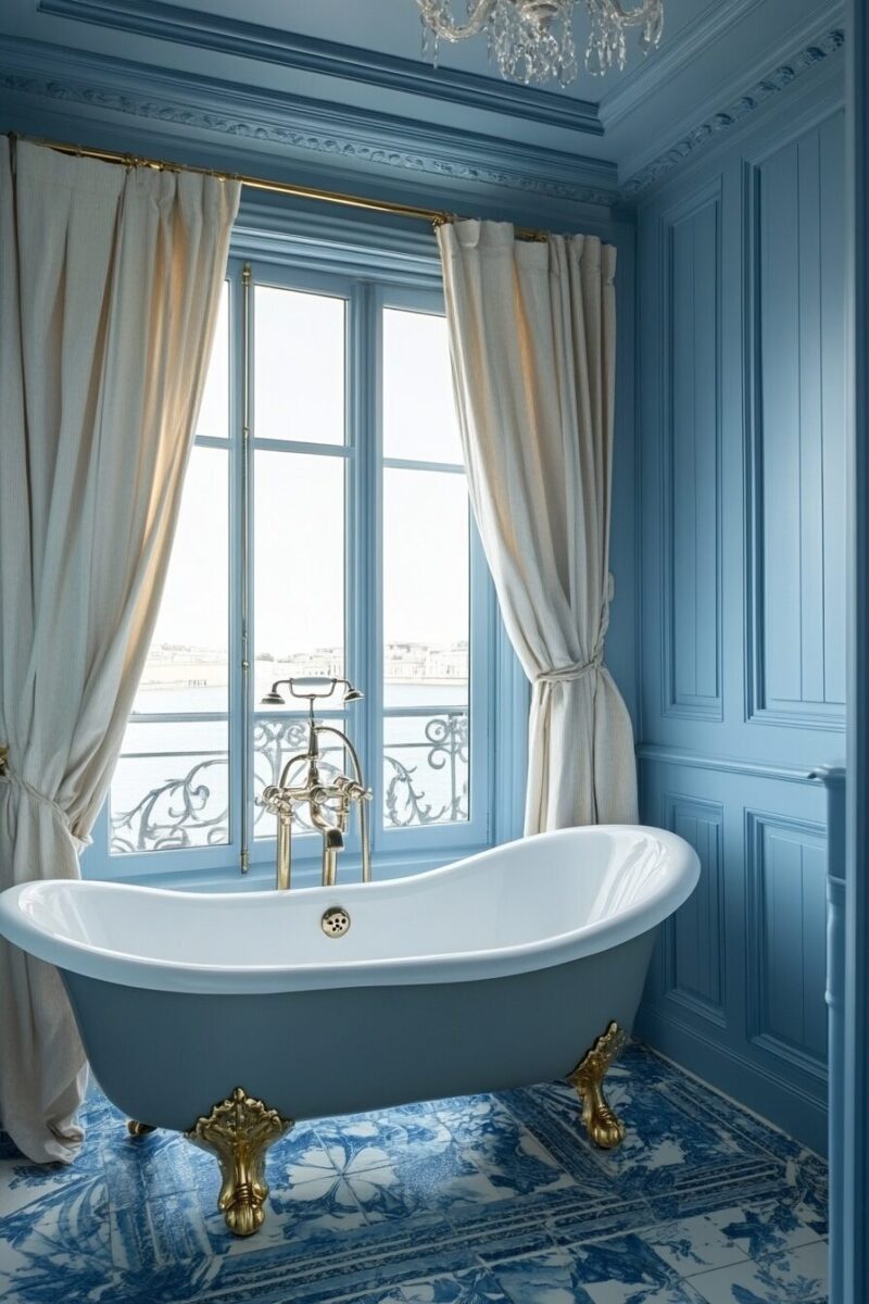For a truly show-stopping effect, consider a French blue clawfoot tub as your bathroom’s centerpiece, blending Victorian elegance with contemporary color sensibility.