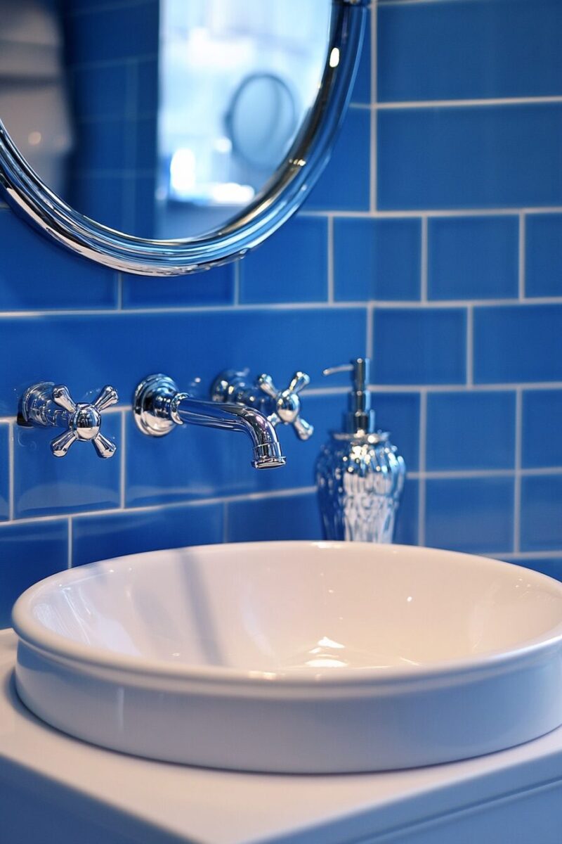 The judicious use of French blue in a primarily white space—perhaps on a single wall or through thin blue grout lines between white tiles—demonstrates that minimalism doesn’t mean colorless.