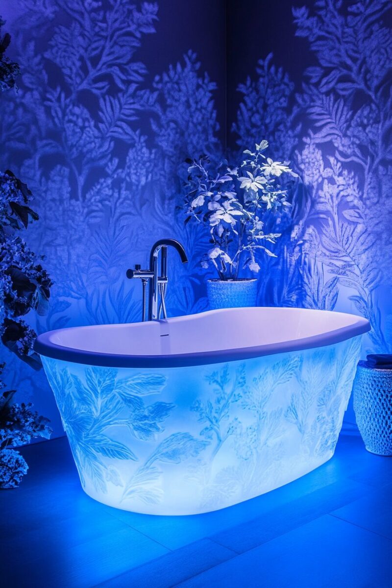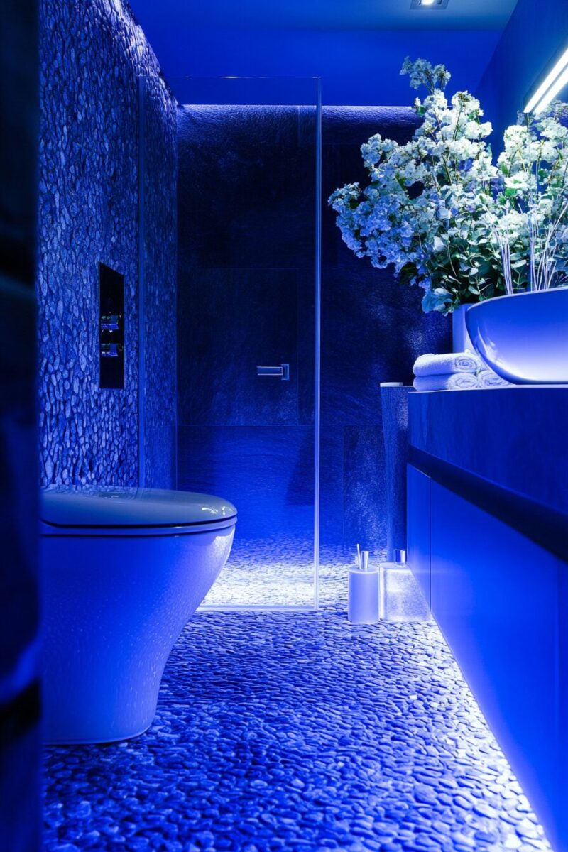 You’ll find that strategically placed blue lighting transforms your bathroom after dark, creating a spa-like retreat that feels worlds away from the standard bathroom experience.