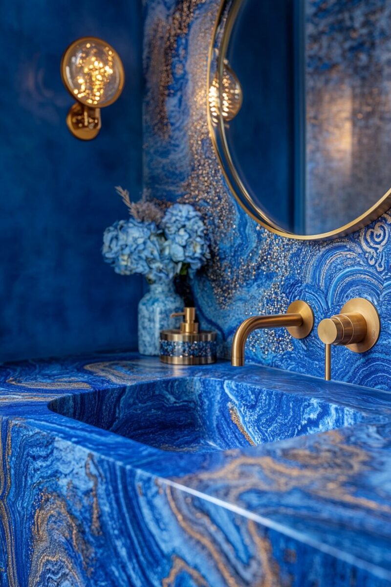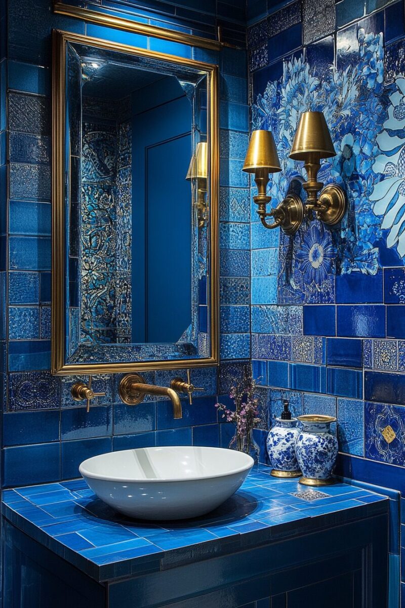The pairing of French blue with warm brass creates an instant luxury signal that elevates any bathroom from ordinary to extraordinary.