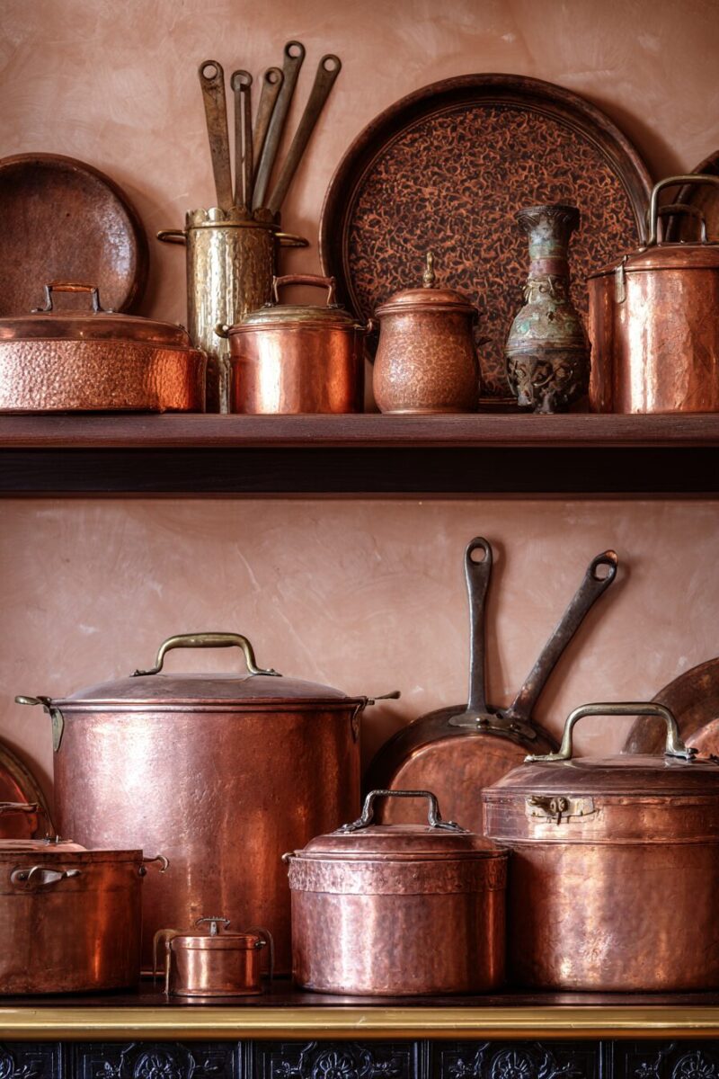 The rich, burnished glow of well-seasoned copper adds instant warmth and authenticity to any kitchen space.