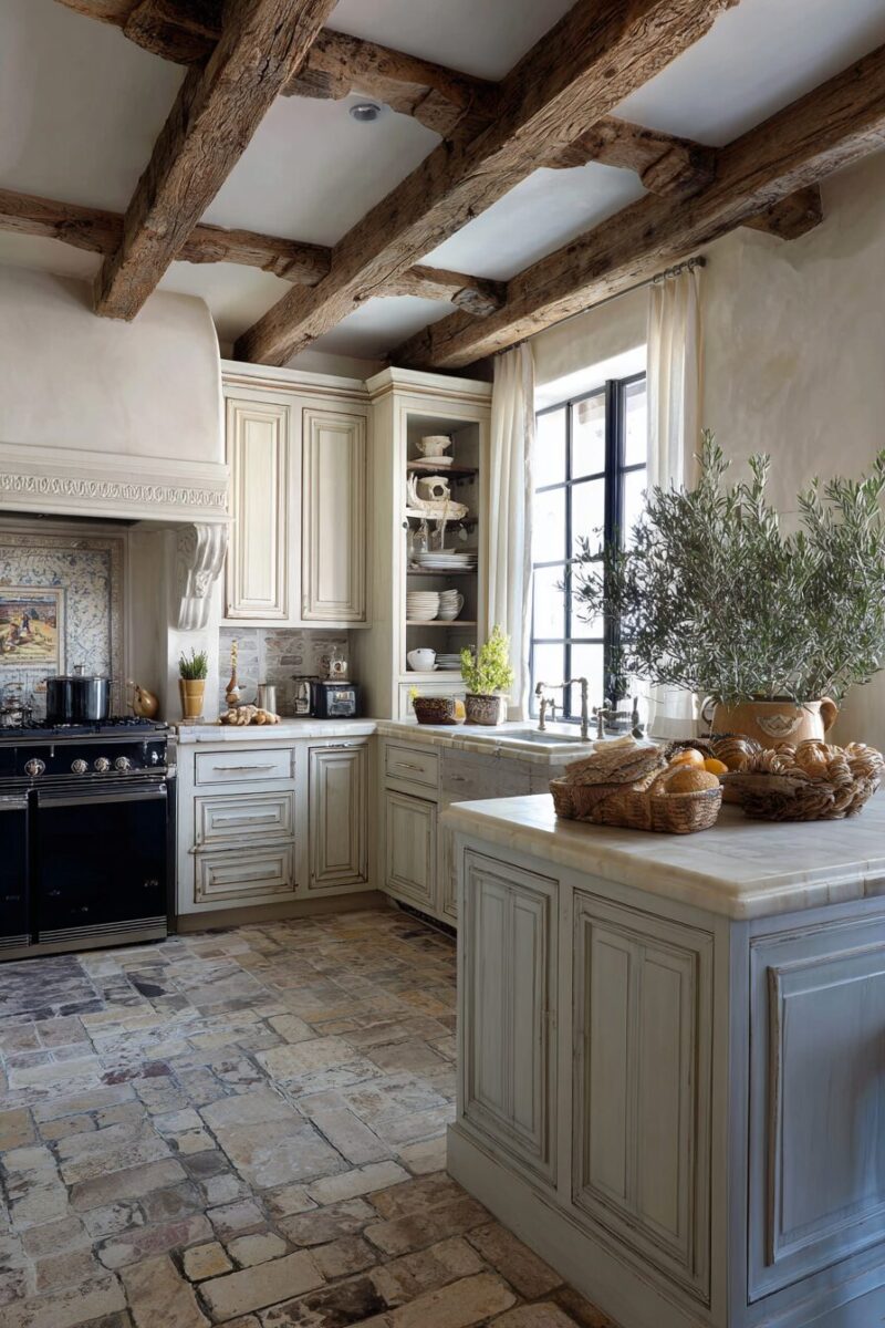 Your kitchen foundation sets the tone for authentic French chateau style with natural stone flooring that has weathered centuries in European castles and country homes.