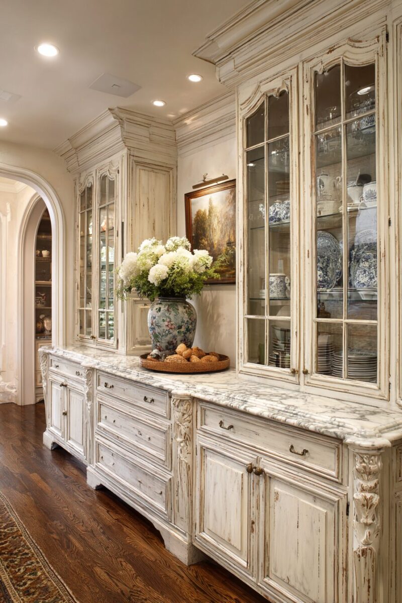Your glass-front cabinets provide the perfect opportunity to display collections of French pottery, vintage glassware, or beautiful serving pieces.