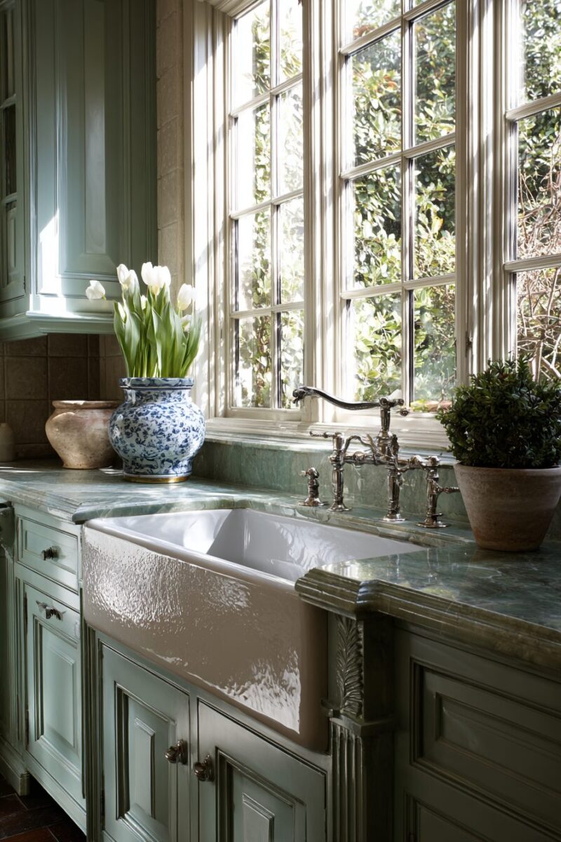 Traditional French farmhouse sinks were often positioned beneath windows to provide natural light for kitchen tasks while offering views of gardens and courtyards.