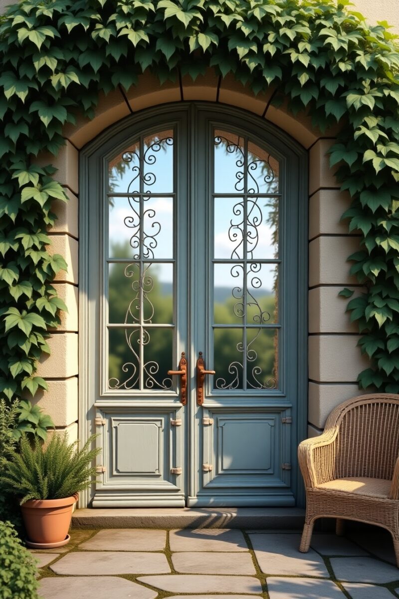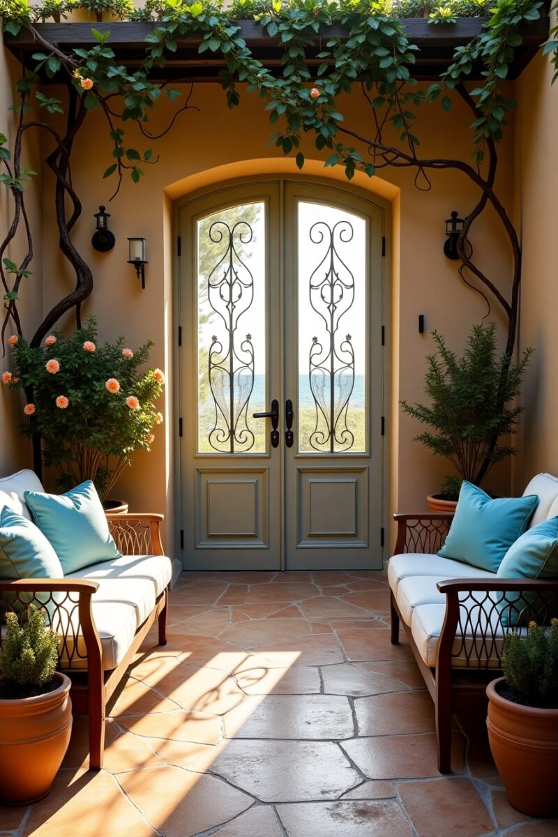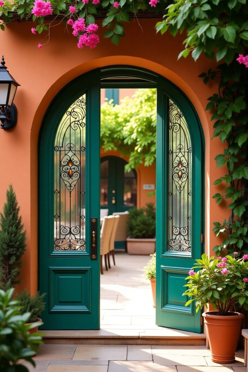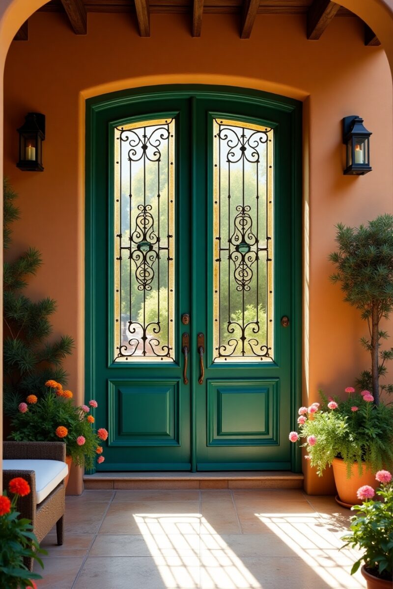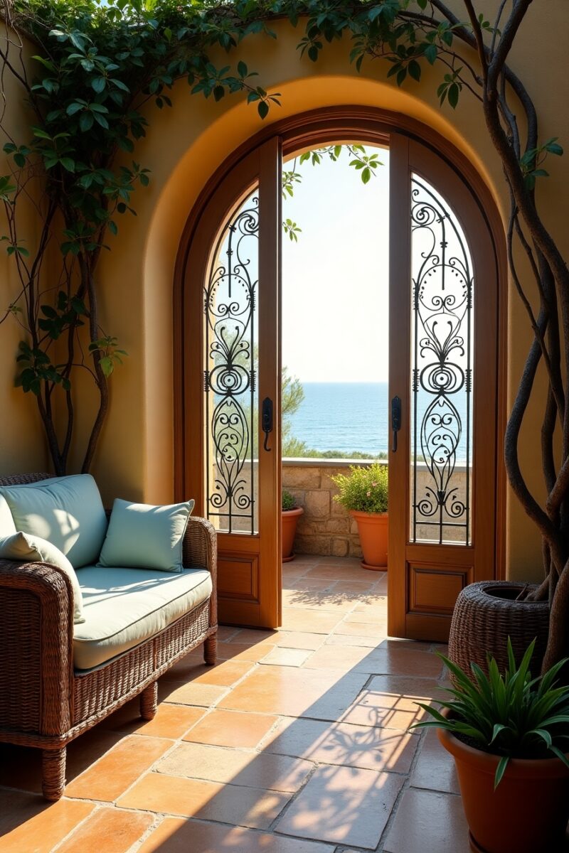 You can enhance the Mediterranean feel by choosing doors with wrought iron details, whether as decorative grilles, hardware, or even custom door handles shaped like olive branches or grapevines.