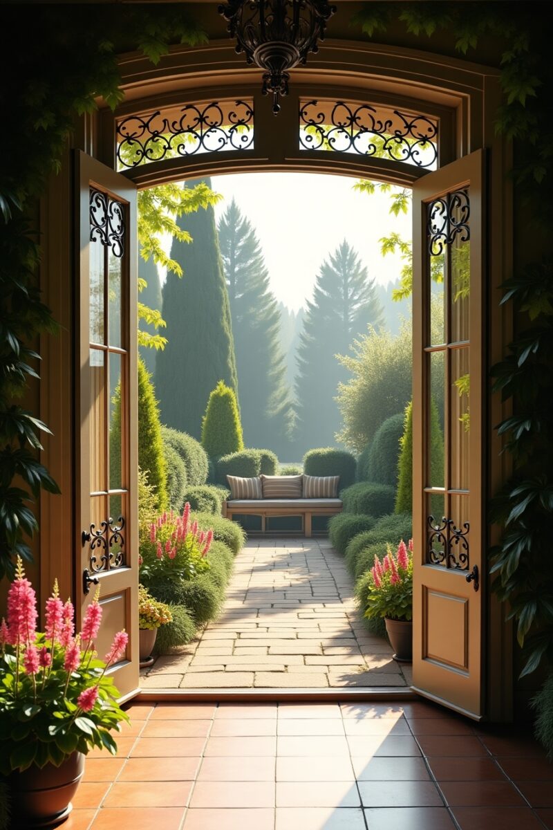 Consider placing focal points like fountains, specimen plants, or garden sculptures directly in the sight line of your French doors to draw the eye outward and create visual interest from inside.