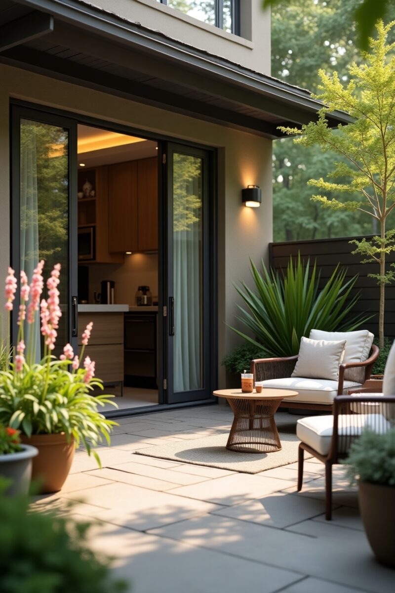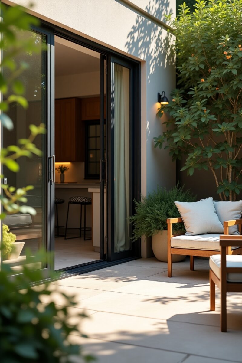 Consider pocket French doors that disappear completely into the wall when open, creating an unobstructed passage to your petite patio without sacrificing any precious square footage.