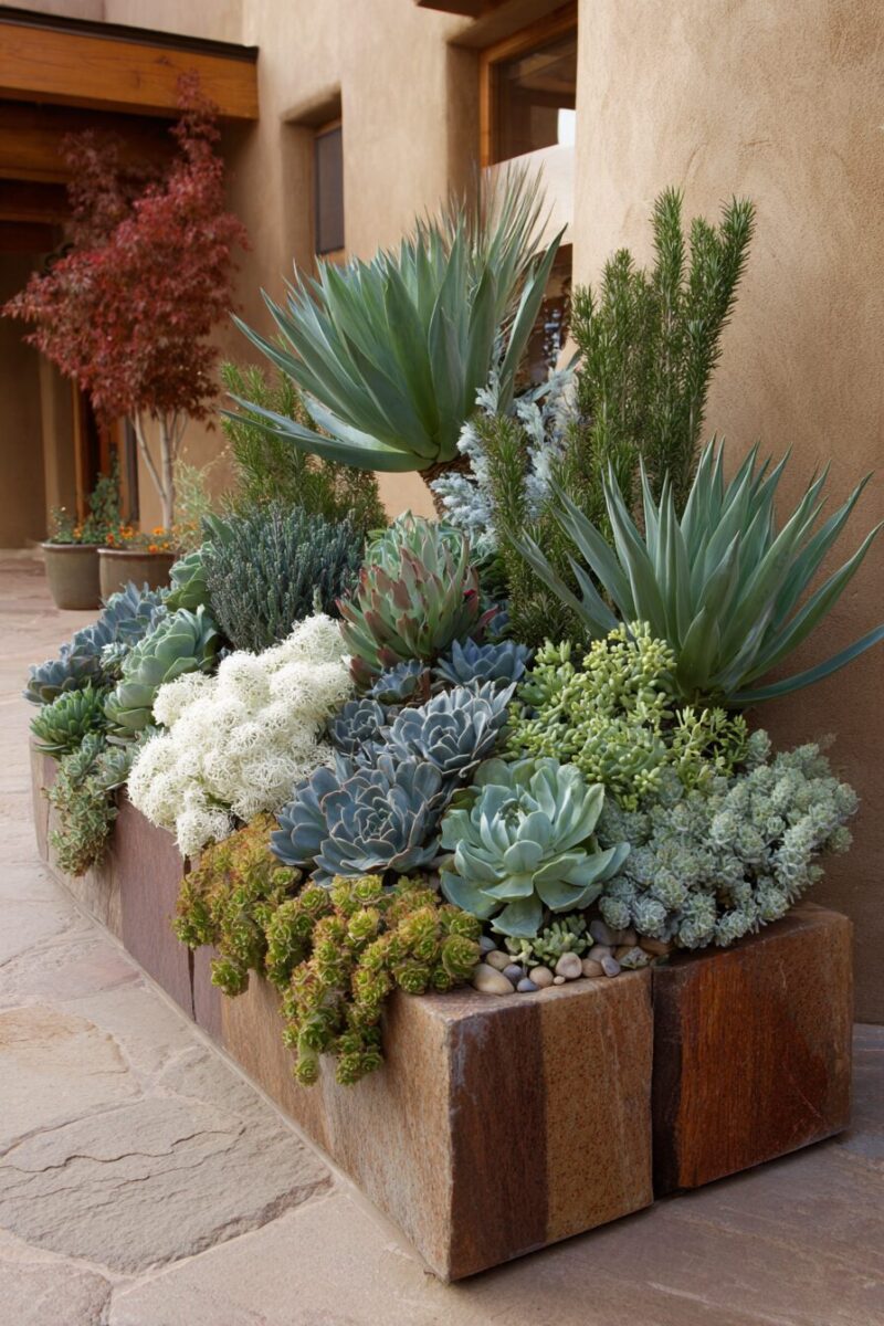 For maximum impact, combine different heights, textures, and colors—pair spiky agave with rounded echeveria, and contrast blue-gray tones with bright lime green sedum.