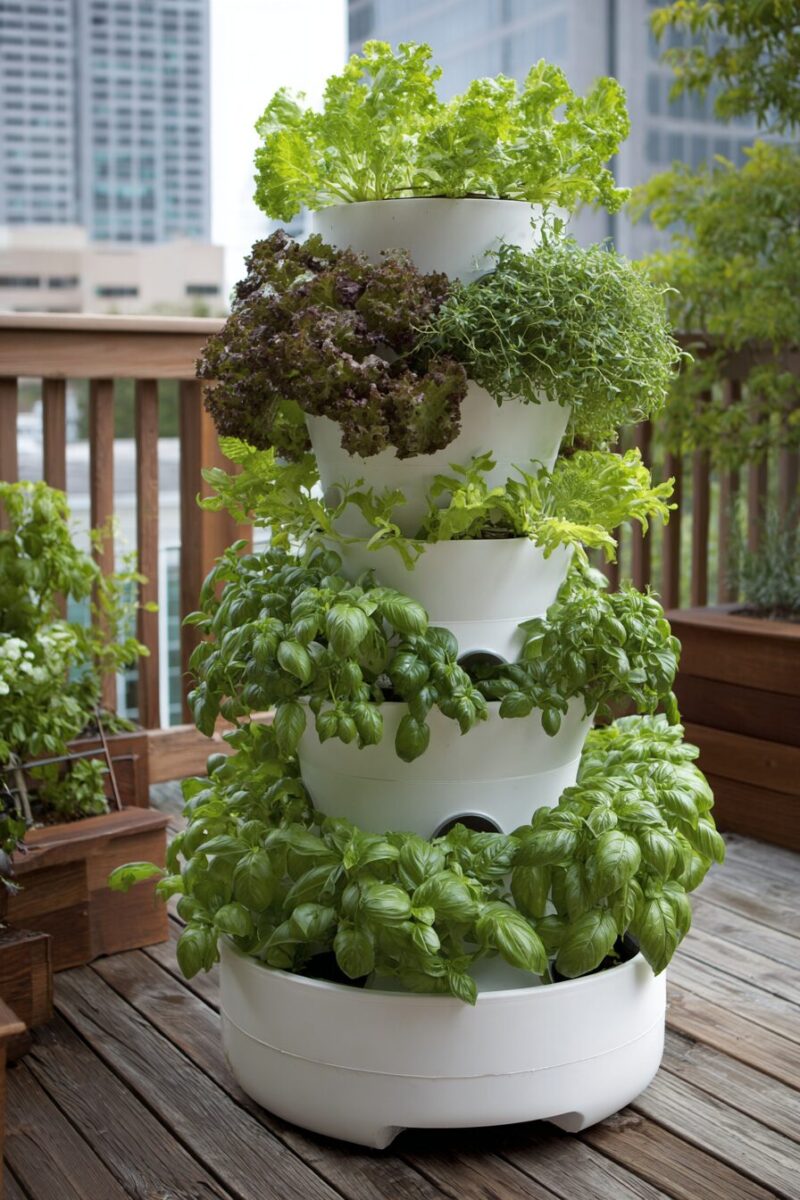 Start with a tiered planter, strawberry tower, or stack of decreasing-sized pots to create a space-efficient vertical growing system perfect for sunny balconies or small patios.