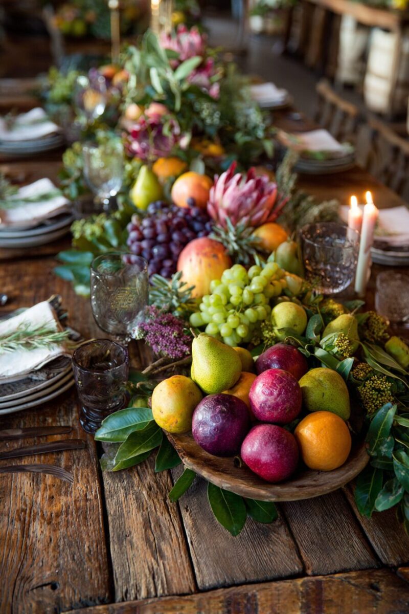 Wooden bowls, wicker baskets, or rustic cutting boards serve as perfect foundations for your edible centerpiece while reinforcing the natural, farm-fresh theme.