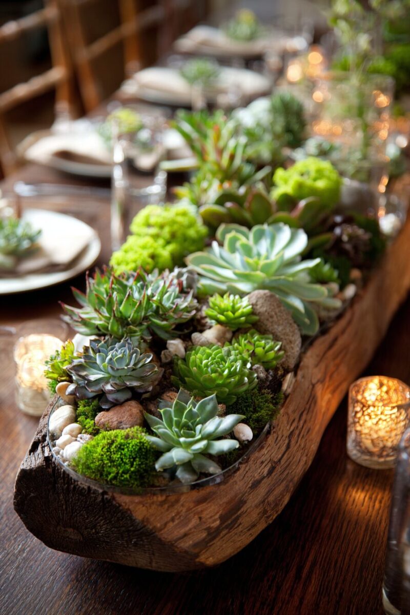 The architectural shapes and subtle color variations of succulents – from blue-green echeveria to purple-tinged jade plants – create sophisticated visual interest without overwhelming your table.