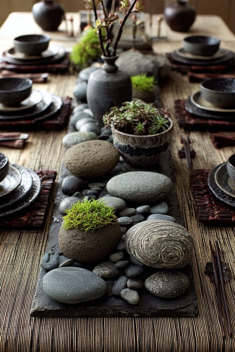 Smooth river rocks and carefully chosen pebbles can transform your dining table into a peaceful zen garden that promotes relaxation and mindful eating.