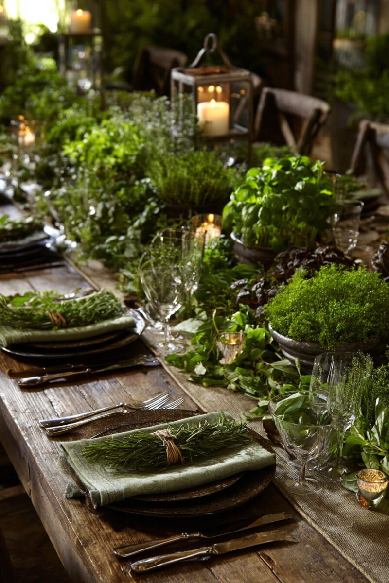 You can extend this theme by incorporating herb-infused waters, cocktails garnished with fresh sprigs, or dishes that showcase the very herbs decorating your table.