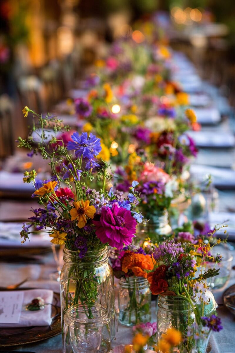 The irregular, organic arrangement of wildflowers creates a relaxed, countryside atmosphere that immediately puts guests at ease and encourages casual conversation.