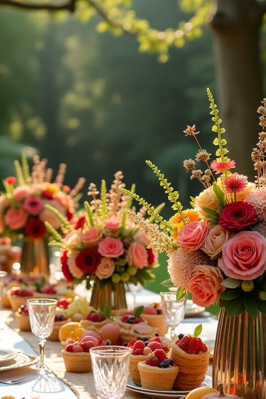 Impress guests by tucking edible flowers like nasturtiums, pansies, or borage into arrangements on food tables – just make sure they’re pesticide-free.