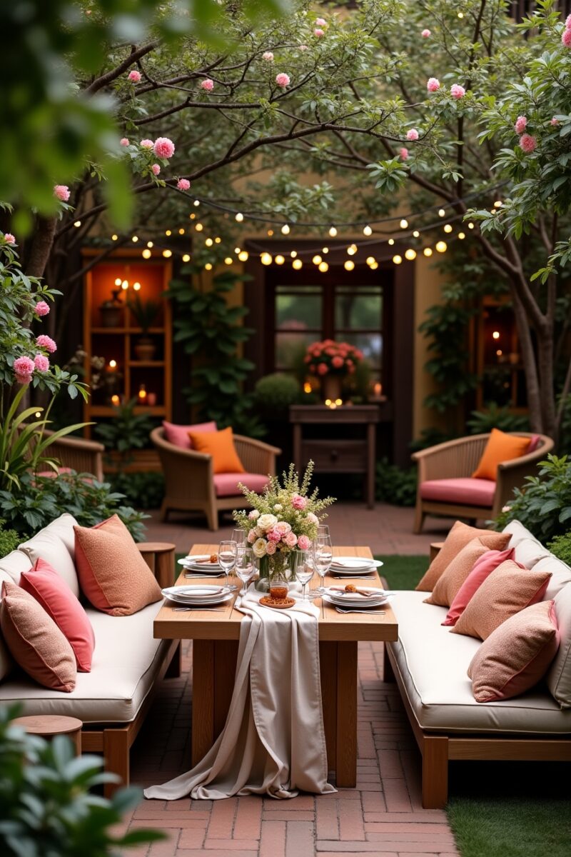 You might position conversation areas near interesting garden features – beside a bubbling fountain, under a flowering tree, or overlooking your best garden view.
