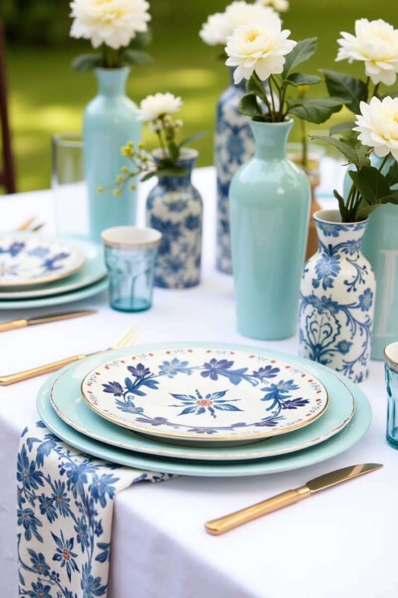 Create an eclectic yet cohesive table setting by combining different patterns that share a common color palette – think various floral patterns in blues and whites or assorted vintage dishes in complementary pastels.